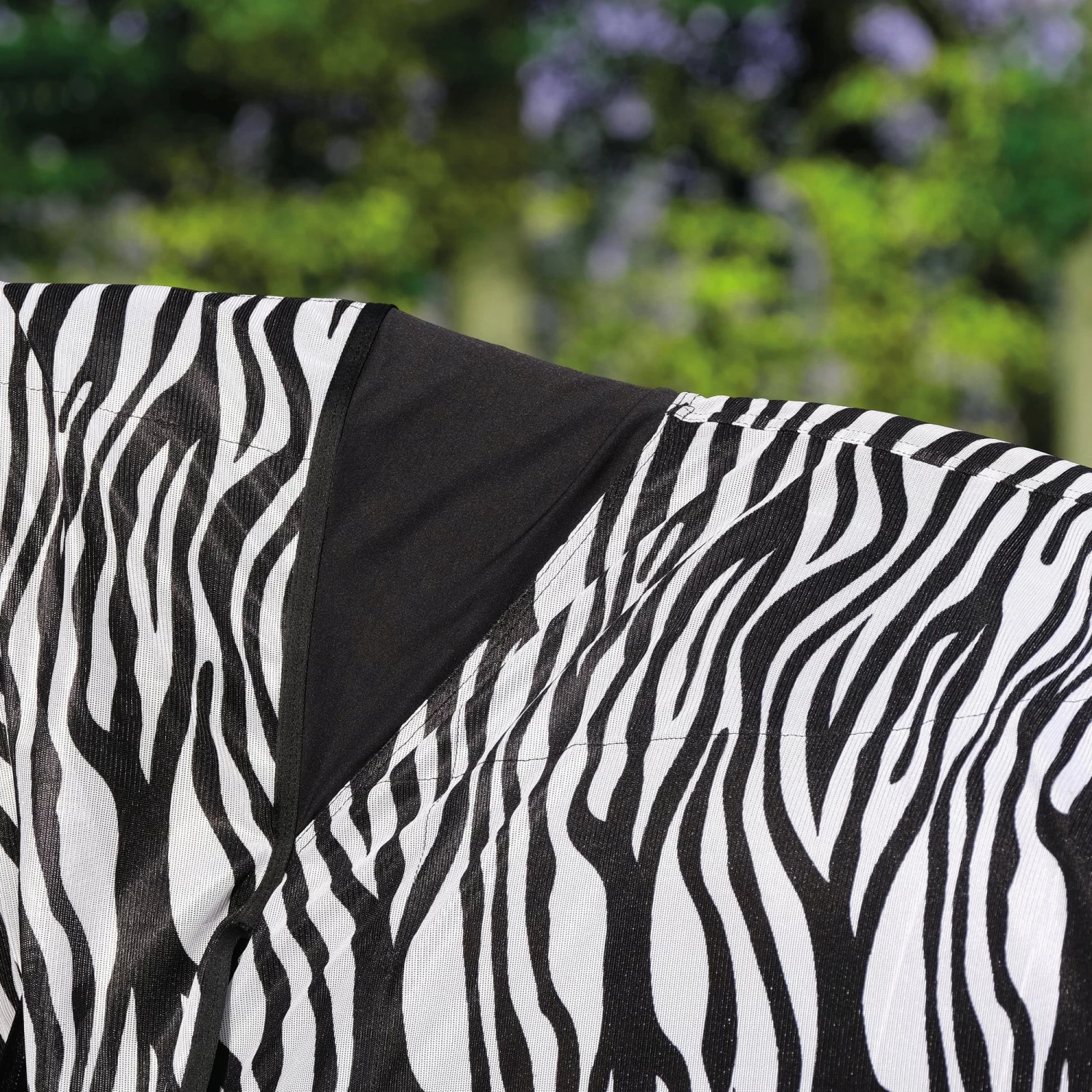 Die innovative Fliegendecke aus leichtem Polyester weist eine feine Spezialwebestruktur auf, welche äußerst schnell trocknet und stets atmungsaktiv bleibt. Der Mähnen-, Brust- und Wirderristbereich ist mit einem glatten, schonenden Satinlining unterlegt. Das wilde, unruhige Strukturmuster in Zebraoptik hält Fliegen und Bremsen zusätzlich fern.