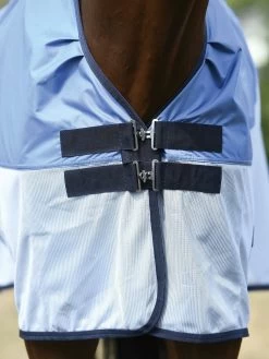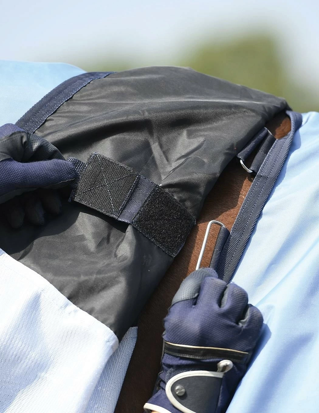 Atmungsaktive und strapazierfähige Kombidecke. Schützt die empfindliche Rückenmuskulatur vor Nässe bei gleichzeitigem Insektenschutz. Komplett mit angenehmen Nylonlining gefüttert. Die Seitenpartie ist aus speziell gewebtem Polyester und besonders widerstandsfähig. Zweifacher T-Verschluss mit integriertem Doppelklett im Brustbereich für optimalen Halt. Widerristpolster aus synthetischem Kautschuk. Die Kreuzbegurtung ist längenverstellbar. Mit tiefer Hinterhandkordel und großzügiger, unterlegter Schweifabdeckung.