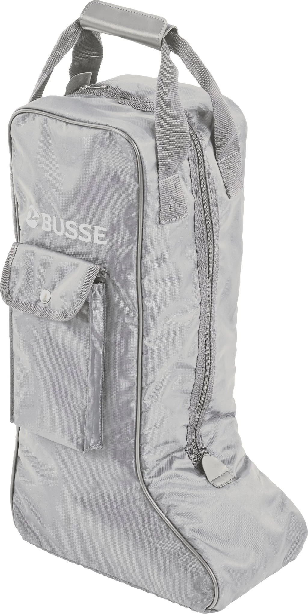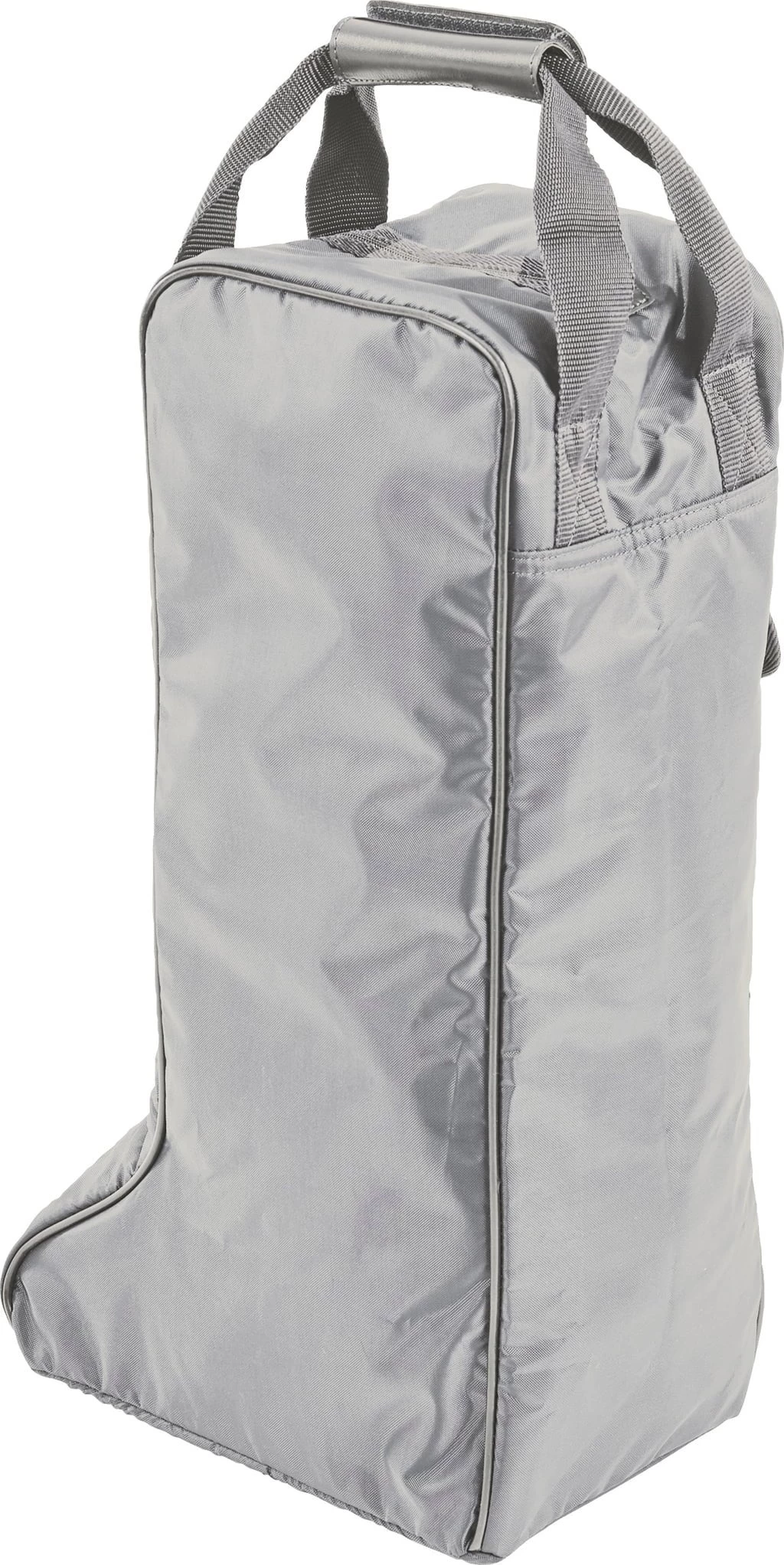 Einfache Stiefeltasche aus pflegeleichtem Polyester mit verstärktem Boden, gepolsterten Seitenwänden und PVC-Standfüßen. Eine weitere Außentasche mit Druckknopf bietet Stauraum für kleine Utensilien wie Sporen, Schuhcreme oder Schuhbürste. Ausgestattet mit zwei Handgriffe und komfortablem Tragepolster.