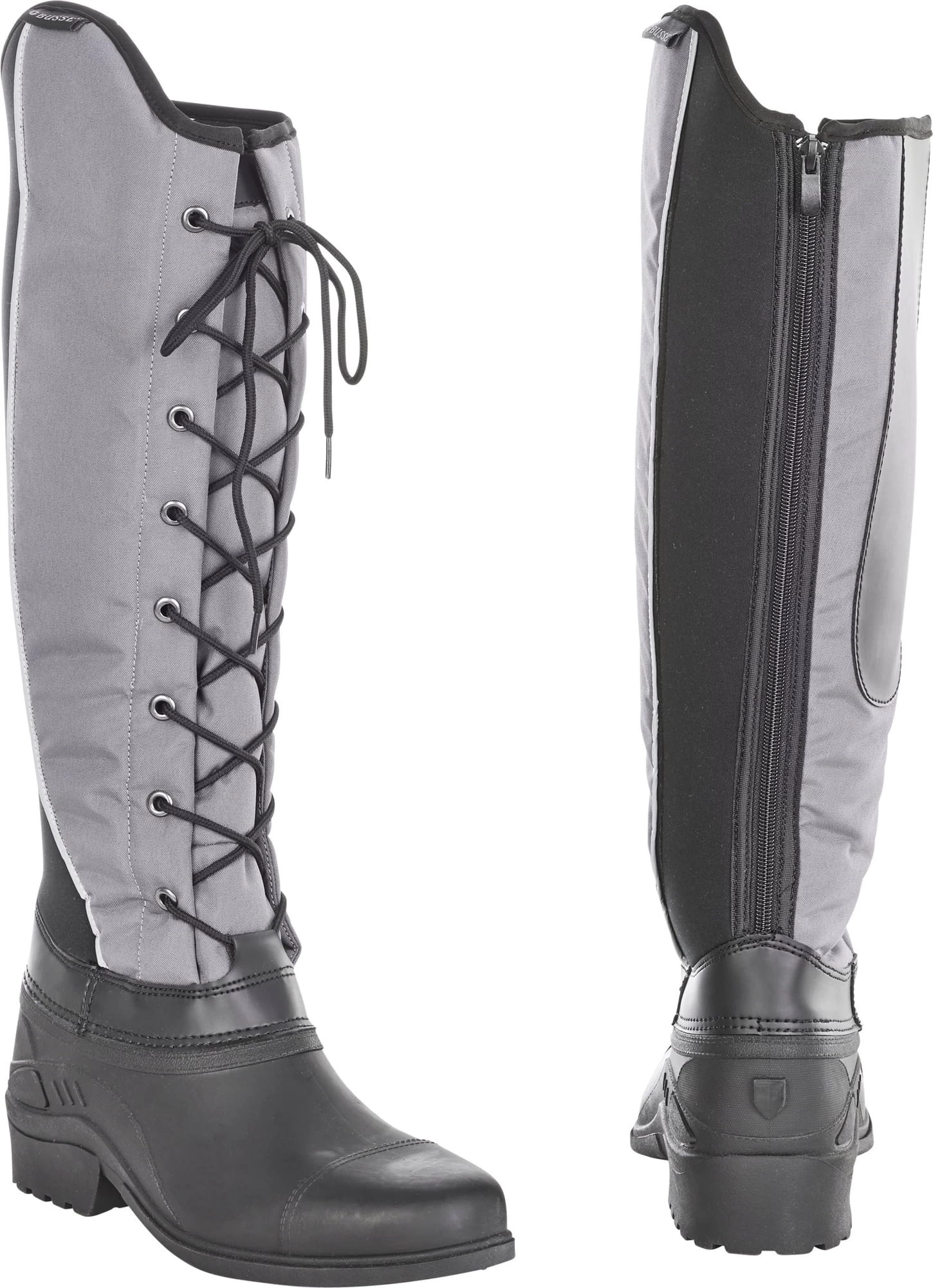 Der warm gefütterte Thermostiefel EDMONTON ist ein Must-Have für kalte Wintertage. Das strapazierfähige Oxford-Polyester an der Außenseite wird mit einem leicht elastischem, synthetischem Kautschuk kombiniert, um eine opitmale Wadenanpassung zu erzielen. Zusätzlich unterstützt eine Poloschnürung die individuelle Passform. Der isolierte Schaft verfügt außerdem über ein warmes, angenehmes Fleece-Lining. Auch das wasserdichte TPR-Fußteil in Reitstiefeloptik ist mit warmem Webpelz gefüttert, damit einer hervorragenden Wärmeisolierung nichts mehr im Wege steht.