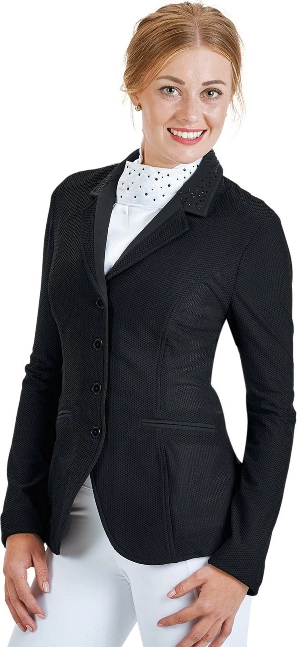 Stylisches Turnier-Sakko aus Hightech-Funktions-Meshmaterial für besonders heiße Tage. Taillierter Schnitt mit vorgeformten Ellenbogen. Perfekter Sitz in der Mittelpositur durch YKK®-Reißverschluss unterhalb der Knopfleiste. Nahezu blickdicht und somit auch mit hellen oder bunten Shirts zu tragen. Ton-in-Ton Strasssteine am Reverskragen und im hinteren Taillenbereich. Angedeutete Fronttaschen und Handytasche innen.