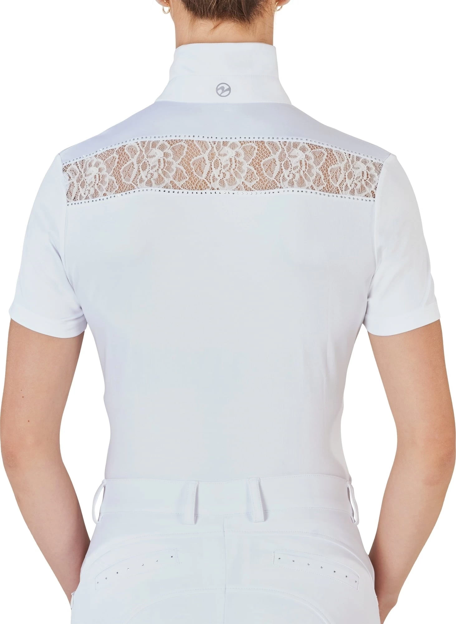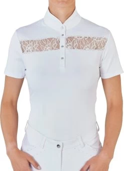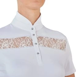 Dieses schön taillierte Kurzarmshirt mit eleganten Details lässt Turnierreiter-Herzen höher schlagen! Geradlinige Spitzeneinsätze über den Brustkorb bringen Abwechslung in den sonst sportlichen Look. Die Spitzenleiste wird von funkelnden Strasssteinen umfasst, um den Effekt noch besser hervorzuheben. Einen weiteren Hingucker bringt der abgerundete Stehkragen und eine Knopfleiste mit großen, strassbesetzten Knöpfen.