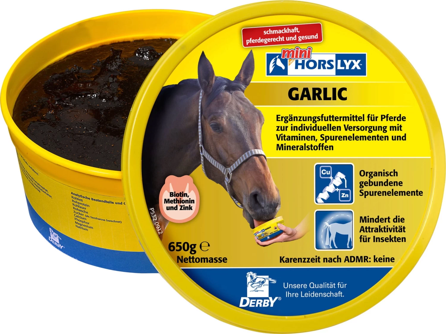 Derby Horselyx Garlic überzeugt durch seine vielfältigen Einsatzmöglichkeiten. Die wetterfeste Leckmasse kann sowohl im Stall, als auch auf der Weide gefüttert werden. Sie sorgt für eine sinnvolle Beschäftigung und kann somit Langeweile und Stress reduzieren. Die Rezeptur ist eiweißarm, besitzt jedoch einen hohen Energiegehalt und eignet sich somit ideal zum Ausgleich von Eiweißüberschüssen. Außerdem unterstützt Horslyx die Mineralstoffversorgung des Pferdes.