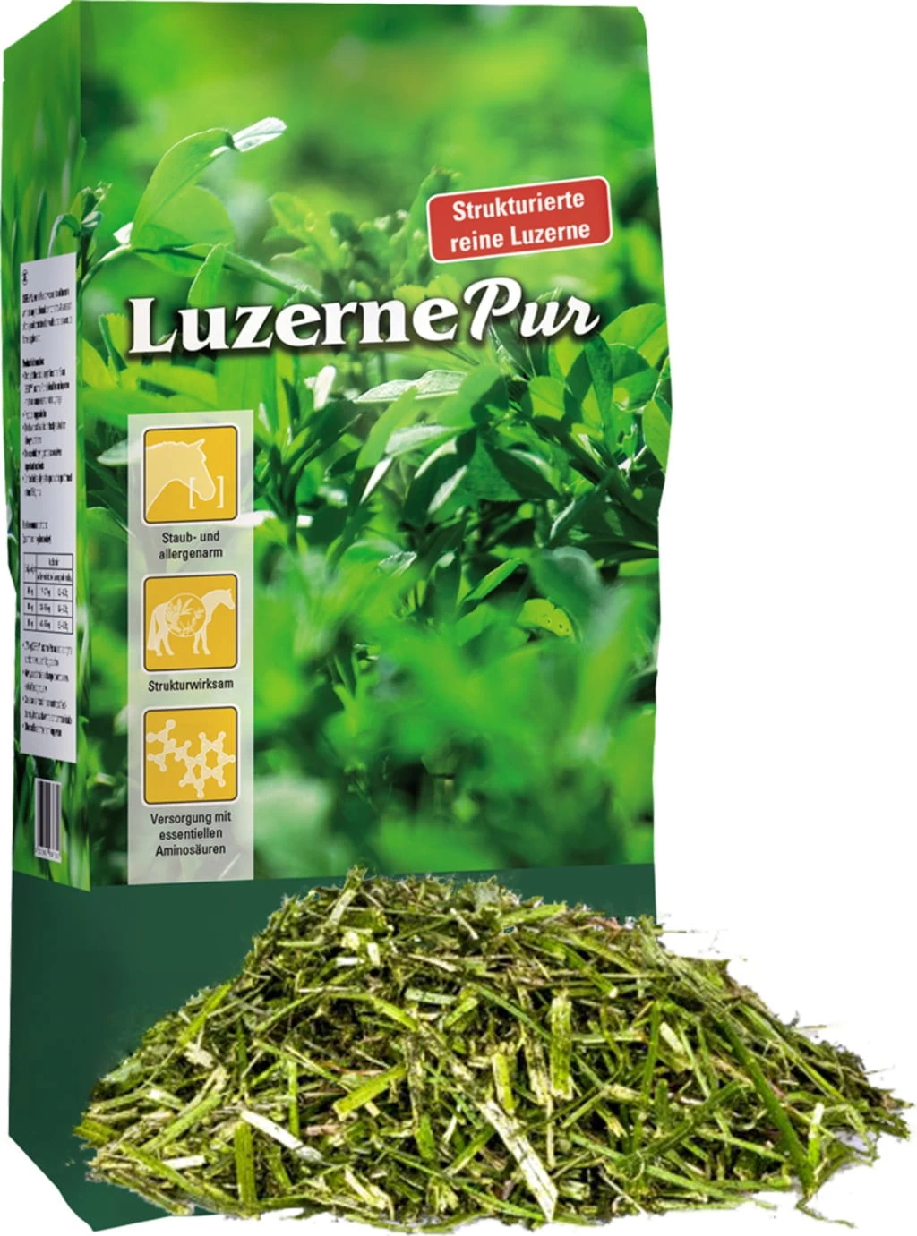 Zusätzlich ist Luzerne ein natürlicher Lieferant von ß-Carotin und Calcium, durch die Zugabe von Sonnenblumenöl äußerst staubarm und kann aufgrund wichtiger Aminosäuren, wie Lysin und Methionin den Muskelaufbau fördern.