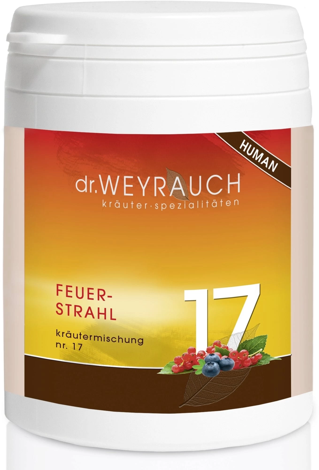 Nr. 17 Feuerstrahl ist ein Vitaminbooster, in dem grundsätzlich sämtliche wasser- und fettlösliche Vitamine, besonders aber die Vitamine des B-Komplexes in eine Grundlage aus Honig, Lezithin und rote Früchte eingebettet sind. Diese spezielle Grundlage aus Früchten liefert wichtige sekundäre Pflanzenstoffe wie das Myritillin der Blaubeere, wichtige Bestandteile der schwarzen Johannisbeere und Polyphenole des Granatapfels.