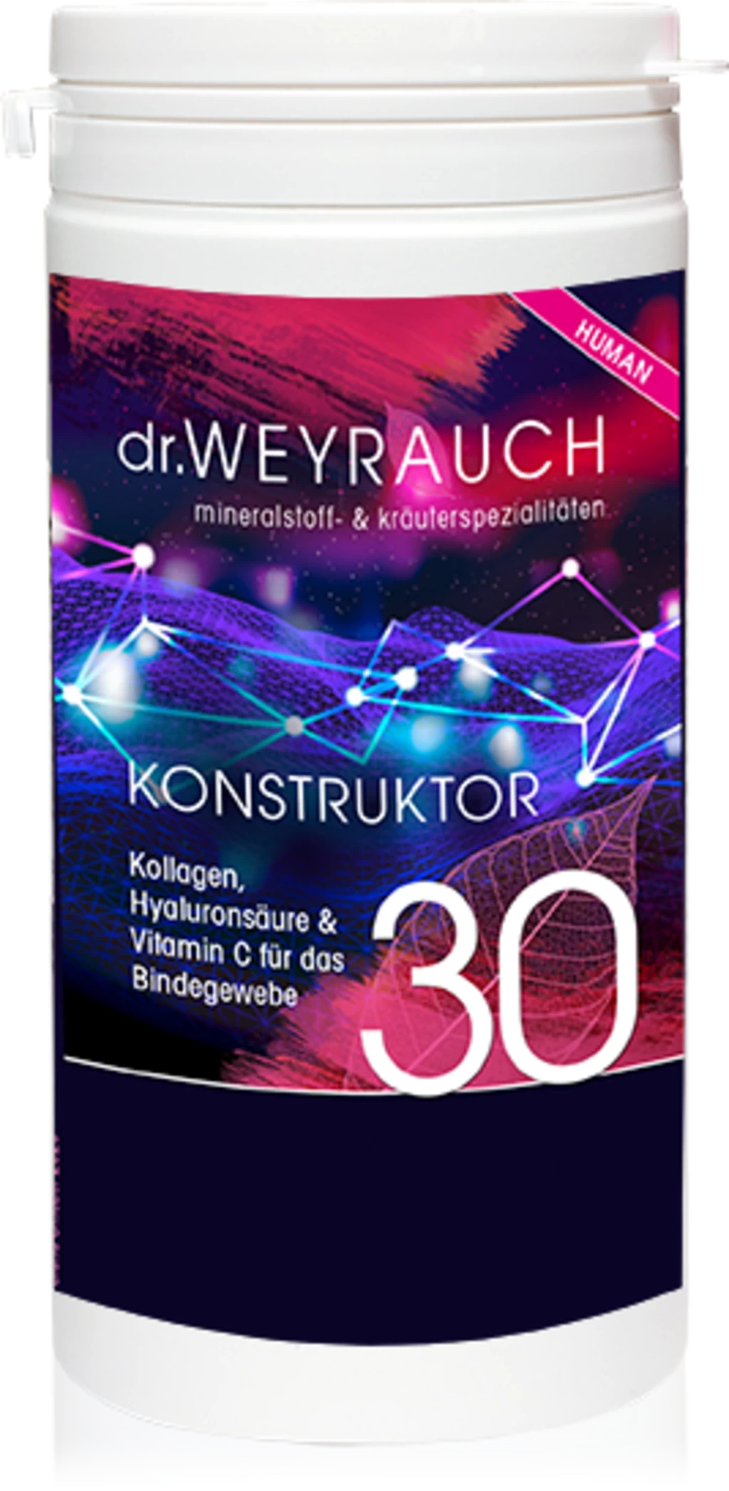 Das Nr. 30 Konstruktor enthält einen stimmigen Komplex aus Kollagenhydrolysat, Chondroitinsulfat und Hyaluronsäure in einer Rotwein-Hagebutten-Melange. Optimiert mit wertvollem Vitamin C.