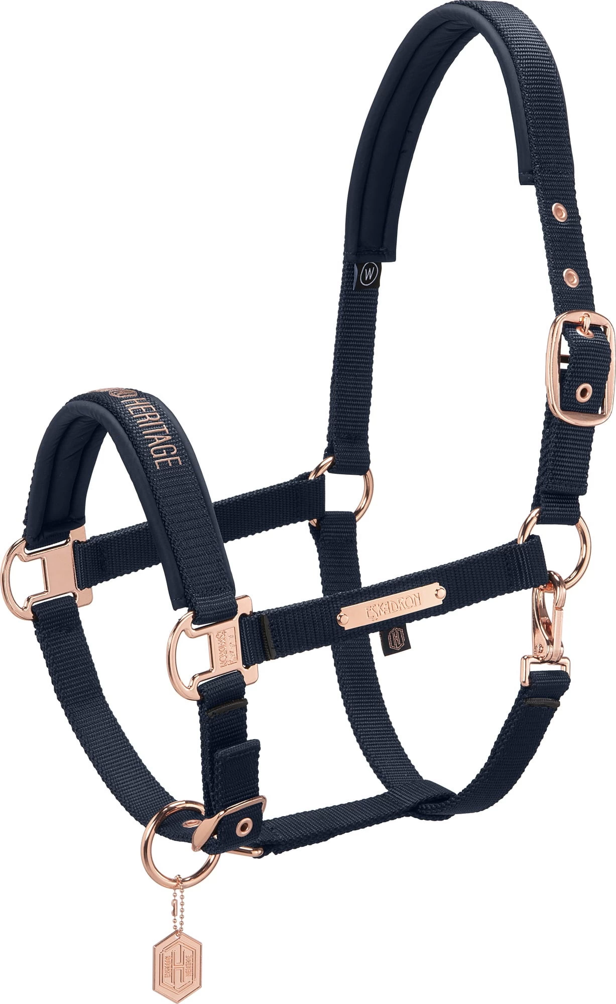 Dieses Halfter bildet dank seiner roségoldenen Metallbeschläge und des schicken Heritage-Schriftzugs am Nasenband einen echten Blickfang.