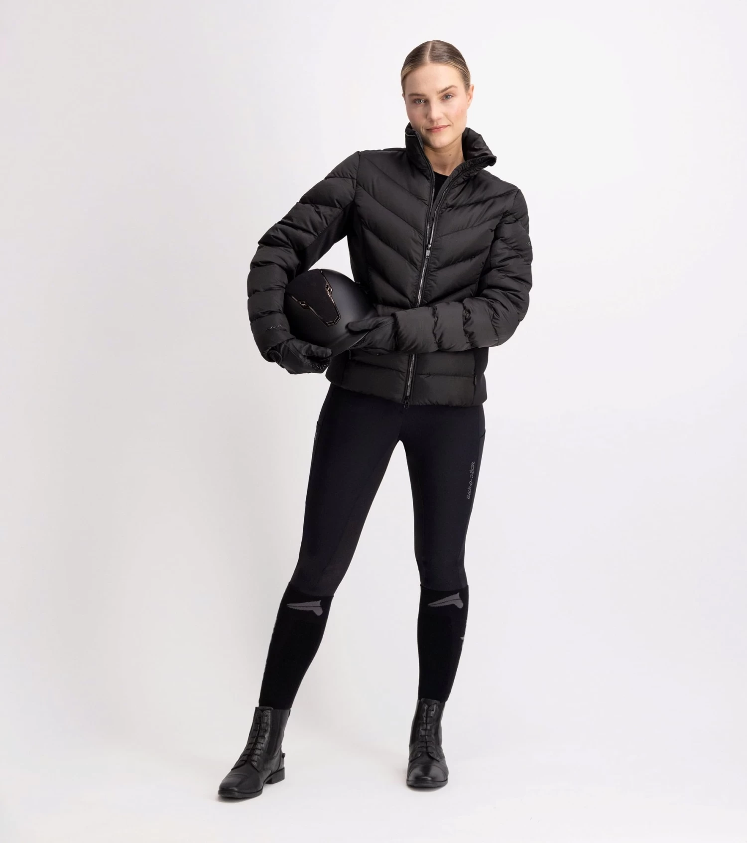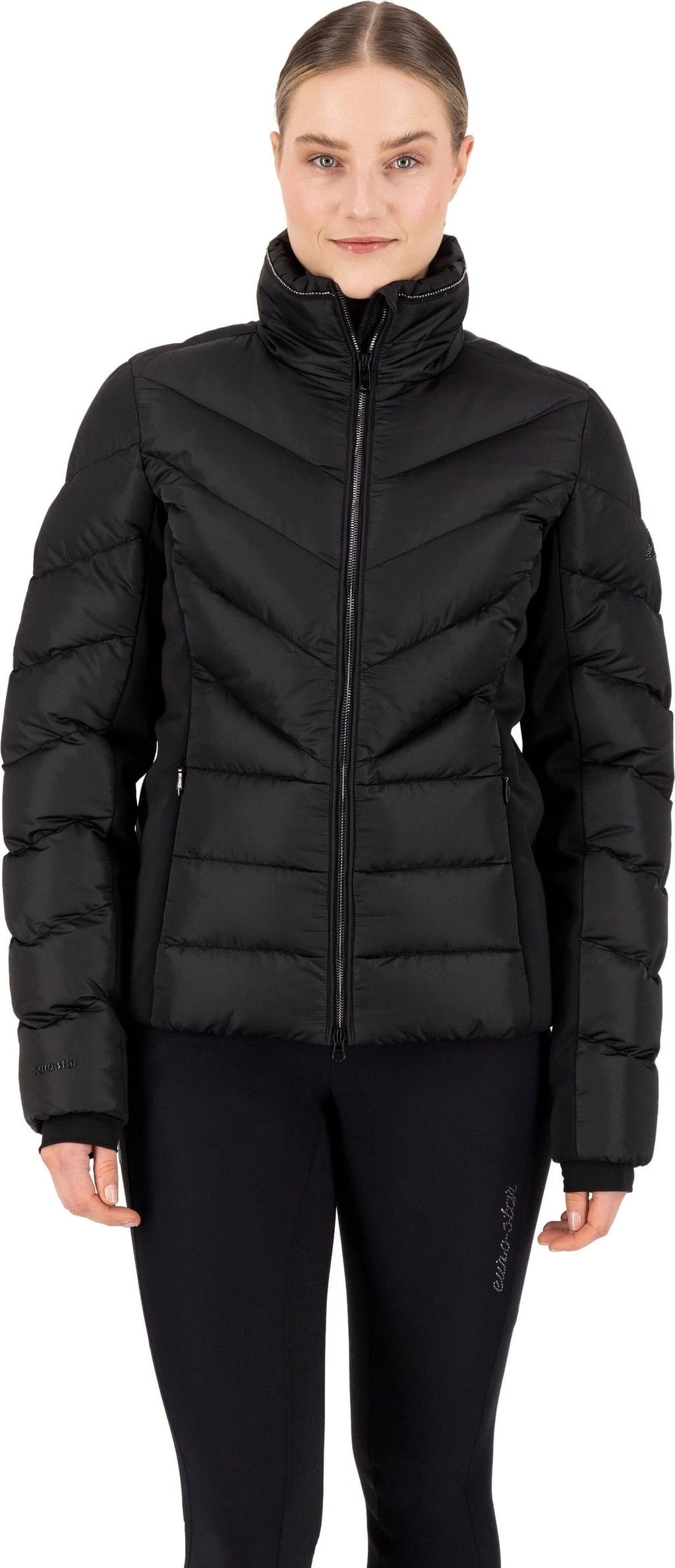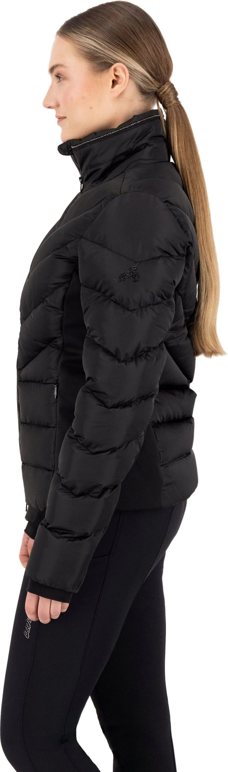 Diese elegante Bomberjacke im Stepp-Format besticht durch ihre perlglänzende Oberfläche und das kombinierte Horizontal- und V-Steppmuster. Strasstein-Akzente entlang des Stehkragens und am linken Ärmel perfektionieren das Design.