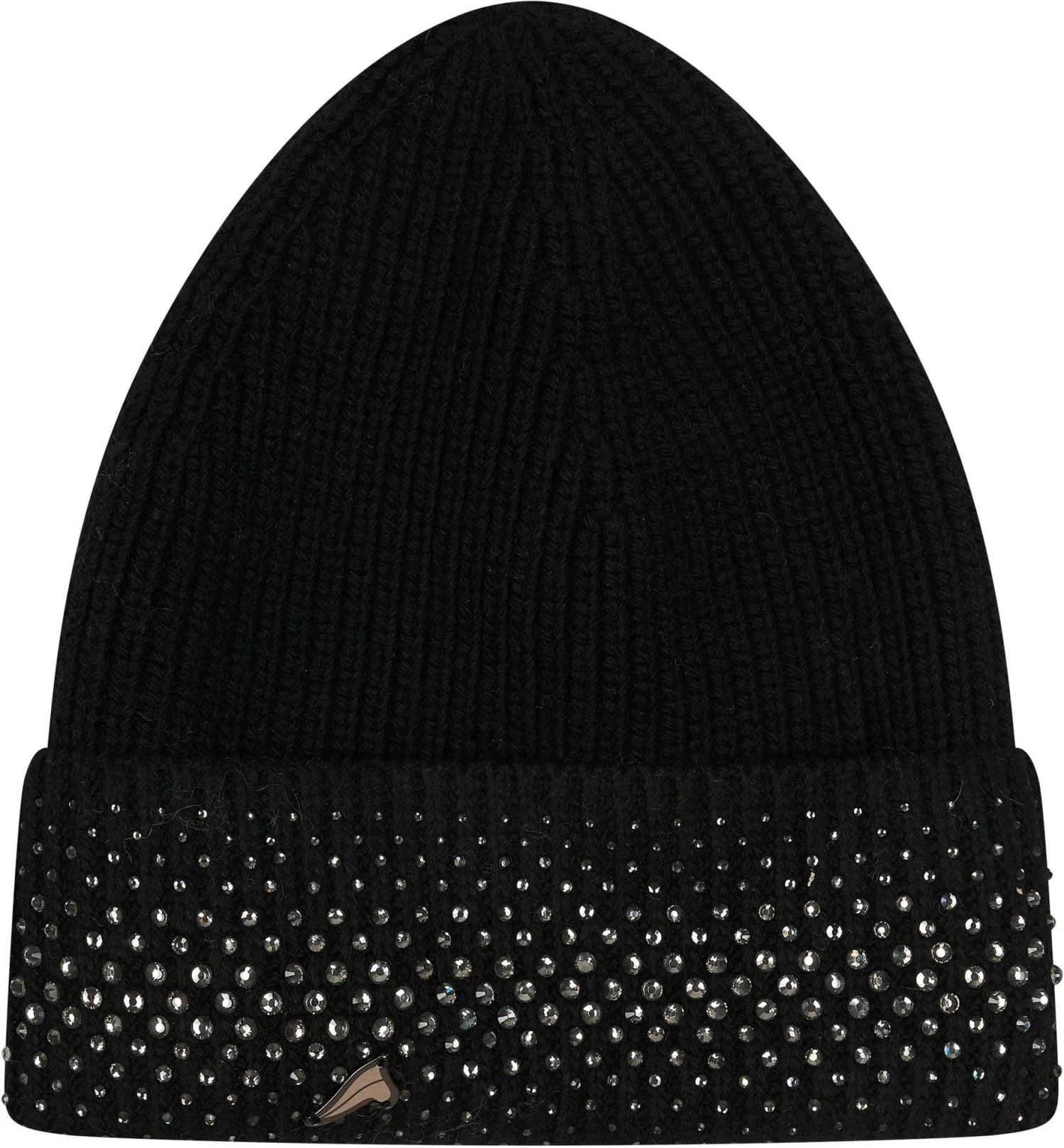 Außergewöhnlich schöne Strickmütze mit funkelnden Strasssteinen am Umschlag. Die weiche Materialkonstruktion umspielt Kopf, Ohren und Stirn mit einer wohligen Wärme. An der Stirnseite rundet eine kleine Marken-Metallplakette das Design ab.