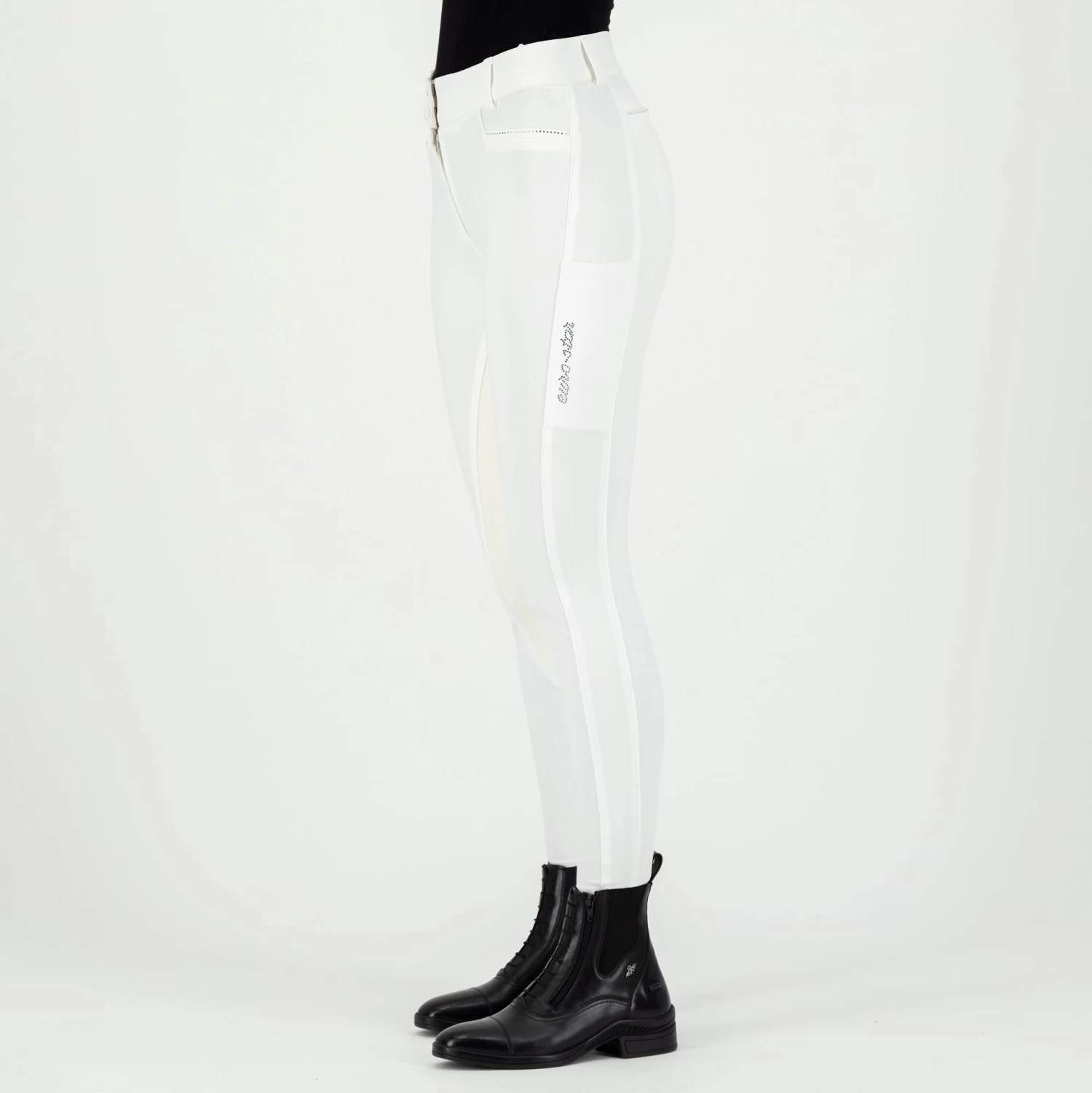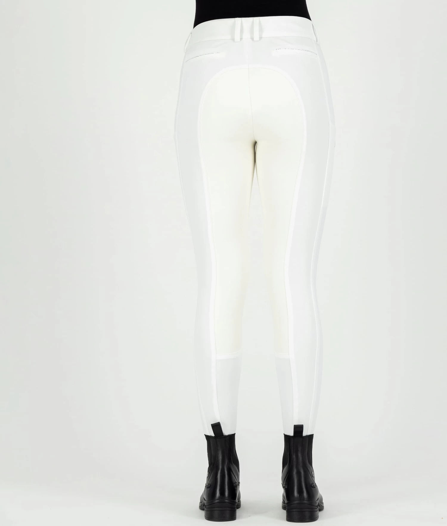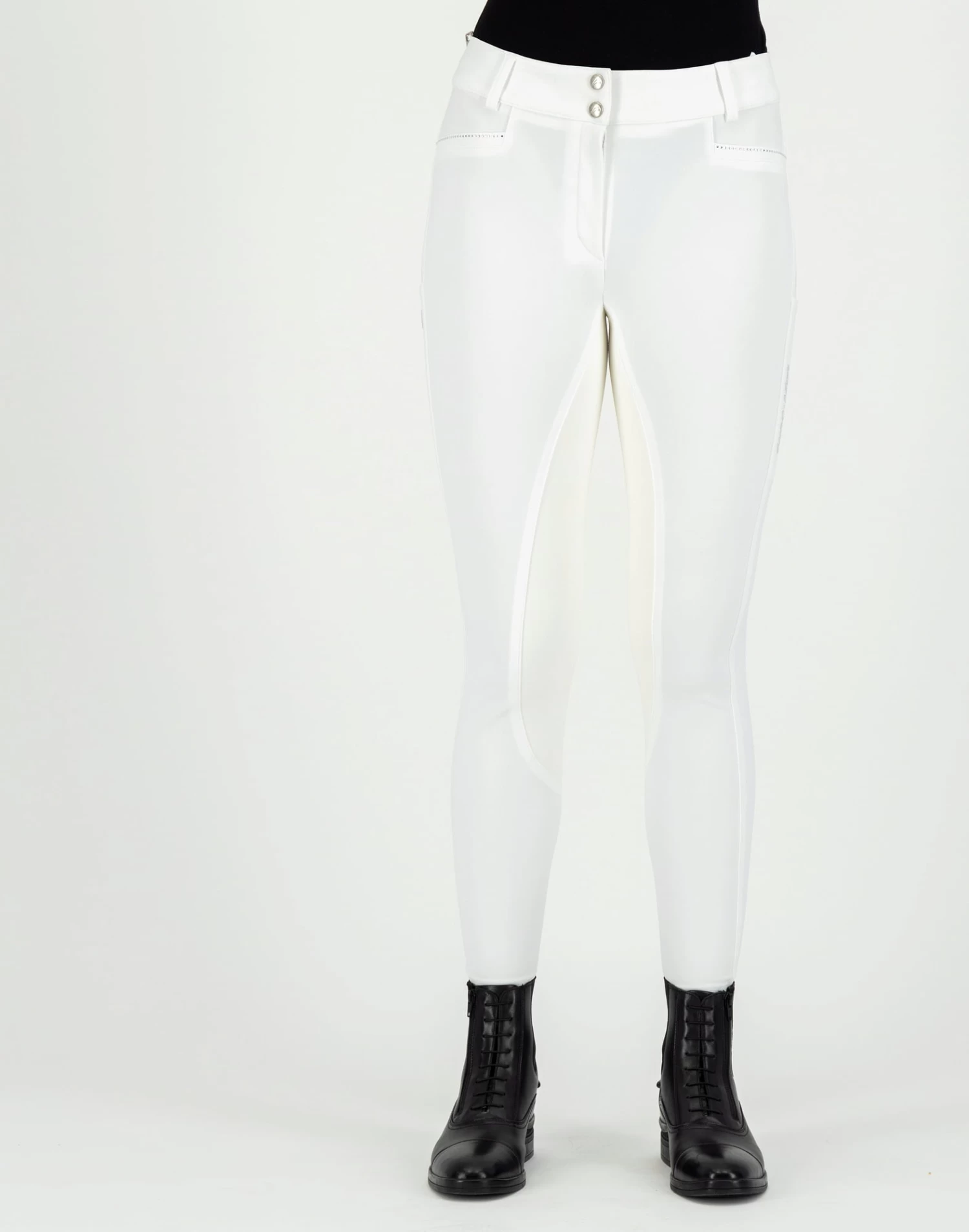 Klassische, schmal geschnittene Vollbesatz Reithose. Der schmale, komfortable Bund ist mit ReiĂźverschluss und Karabinerhaken ausgestattet. Das sportive Design wird von eleganten Metallperlen-Paspeln entlang der Taschenlinien und von einem Strass-Logo-Schriftzug umspielt.
