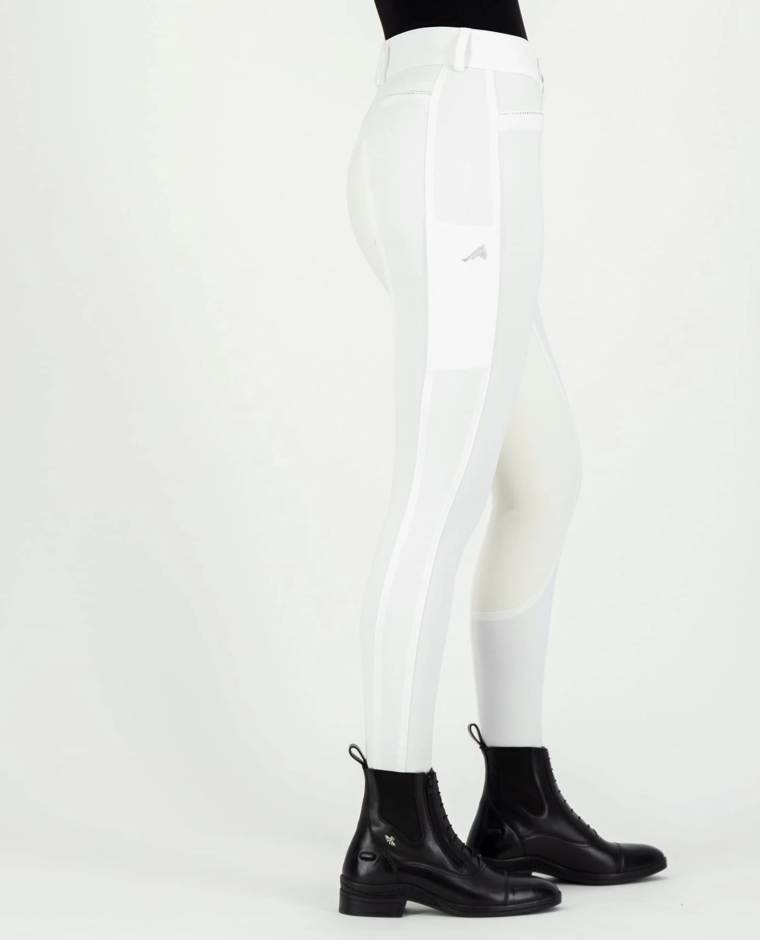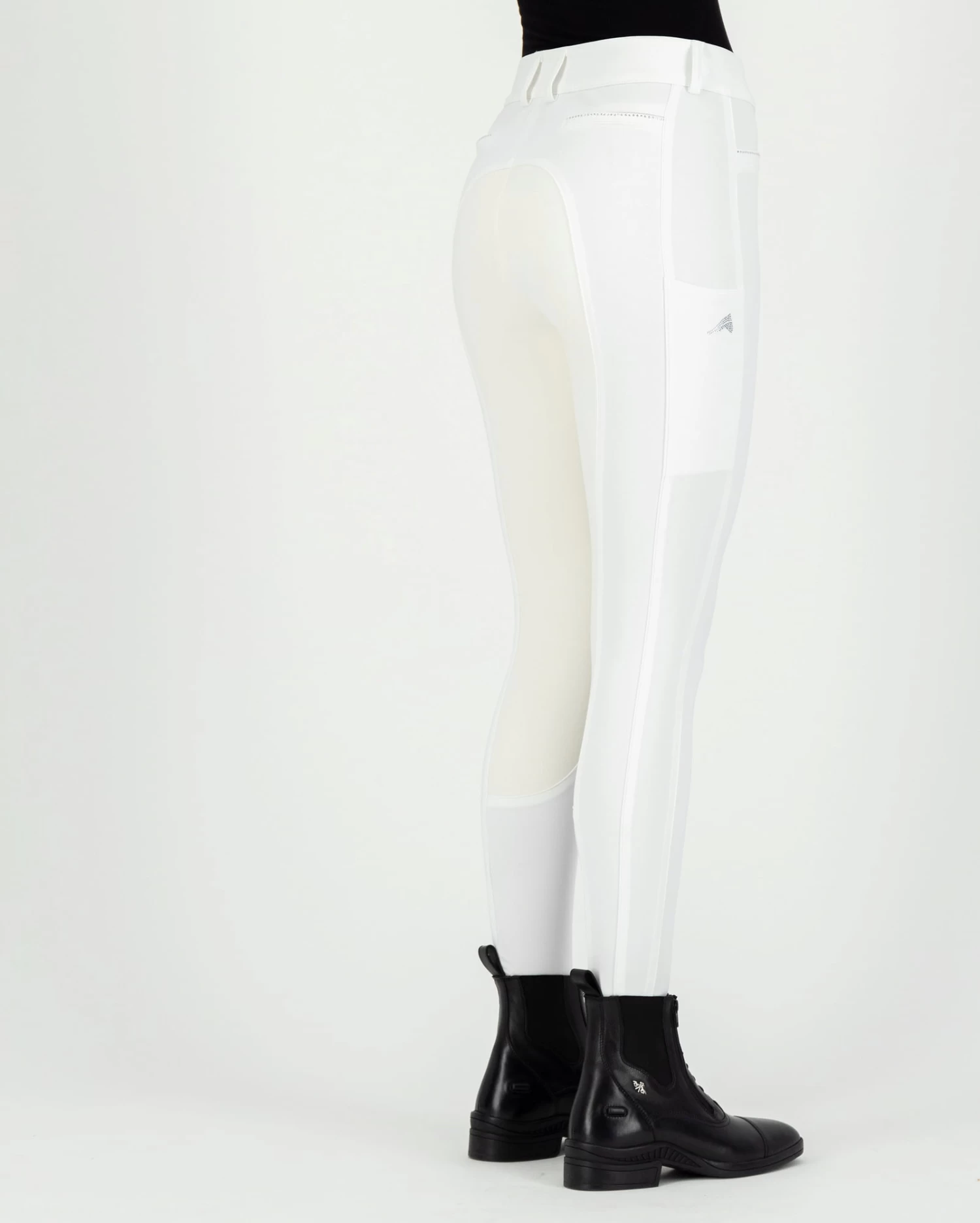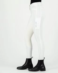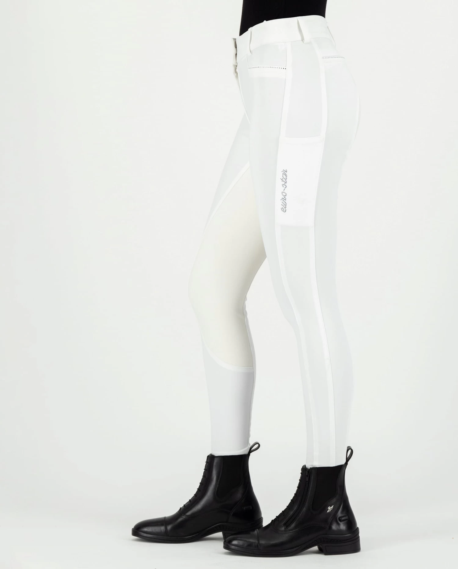 Klassische, schmal geschnittene Vollbesatz Reithose. Der schmale, komfortable Bund ist mit ReiĂźverschluss und Karabinerhaken ausgestattet. Das sportive Design wird von eleganten Metallperlen-Paspeln entlang der Taschenlinien und von einem Strass-Logo-Schriftzug umspielt.