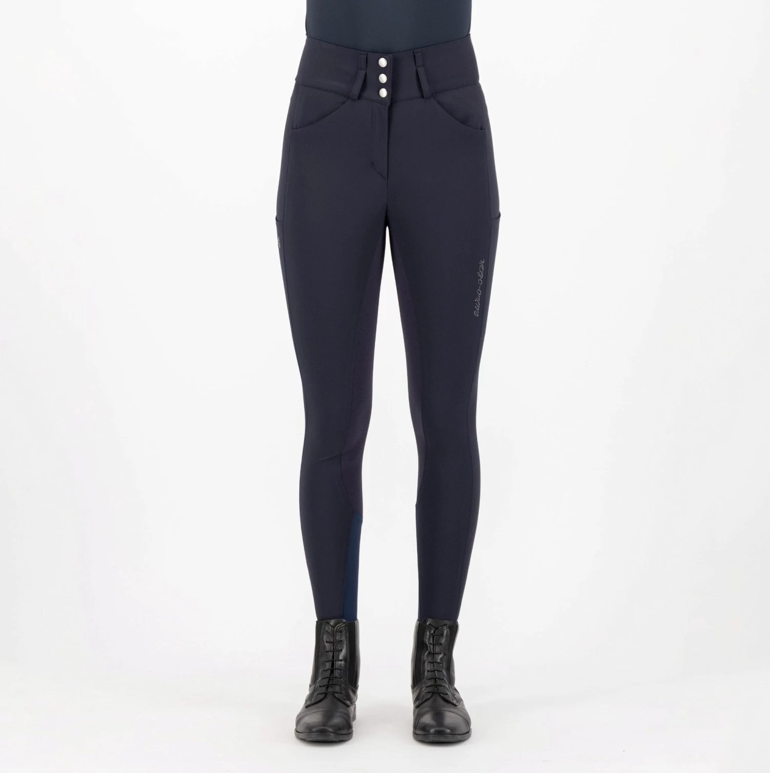 Klassische Reithose mit hoher bequemer Taille, drei Karabinerhaken-Knöpfe und einem Reißverschluss. Zwei schräg gesetzte Taschen an der Vorderseite und eine Handytasche mit sauberem Blindsaum gewähren Platz für Handy, Geldbörse oder Schlüssel. Zudem schmeicheln dem Design zwei Faketaschen mit Klappen am Gesäß.