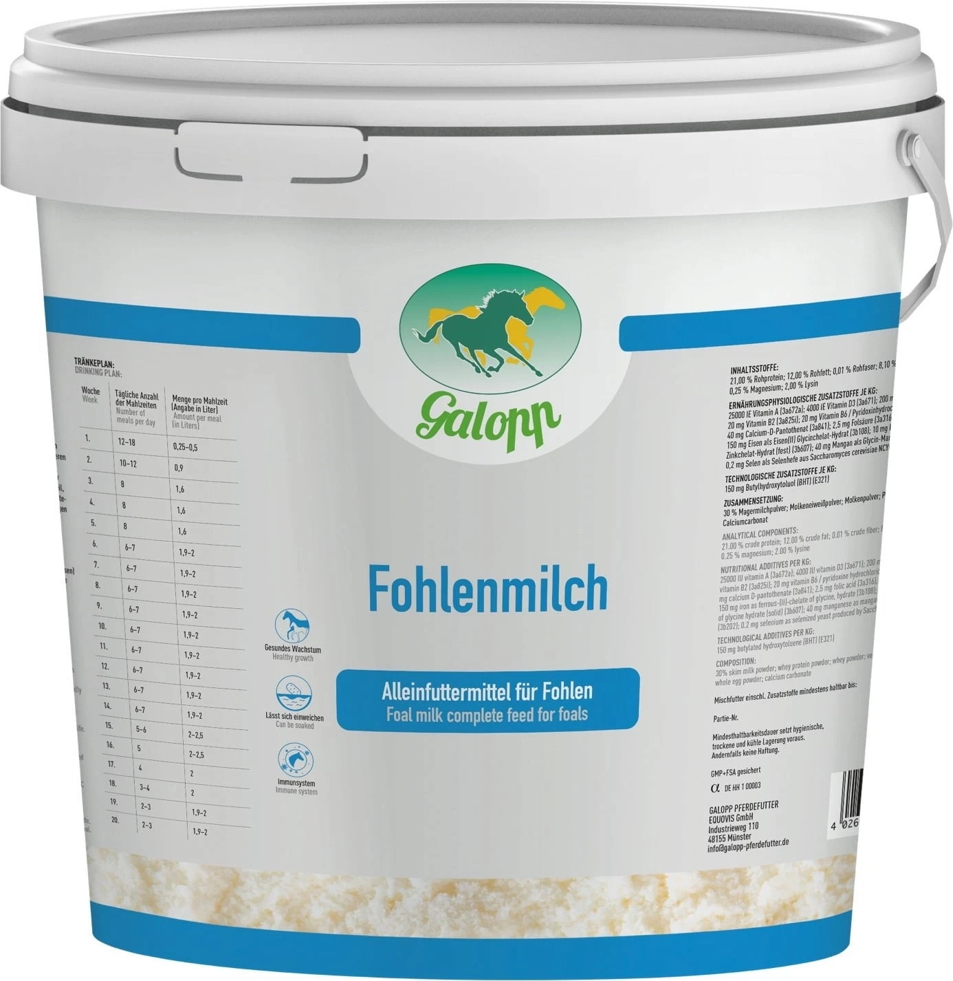 Die Fohlenmilch von Galopp kombiniert eine optimale, nährstoffreiche Zusammensetzung zur Vollversorgung verwaister Fohlen. Auch Fohlen von Mutterstuten, die unzureichend Muttermilch produzieren, können von der Fohlenmilch profitieren. Die Rezeptur enthält alle wichtigen Nährstoffe, welche die Wachstumsförderung unterstützen können. Der hohe Magermilchanteil macht die Galopp Fohlenmilch besonders verdaulich und schmackhaft. Zur Unterstützung körpereigener Abwehrkräfte ist die Rezeptur mit Immunglobuline angereichert.