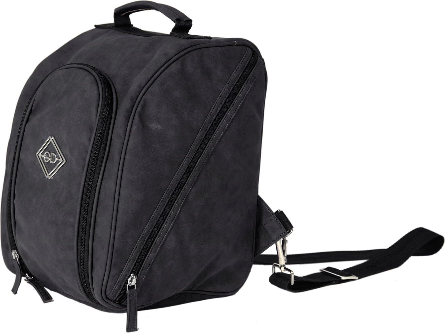 Moderne Helmtasche mit künstlichem Kaninchenfell auf der Innenseite um den Helm optimal zu schützen, egal ob beim Transportieren oder Lagern. An der Seite befinden sich zwei kleinere Taschen um Kleinigkeiten aufzubewahren. Es gibt oben einen großen Griff und auf der Rückseite einen verstellbaren Riemen. Mit Füßen am Boden.