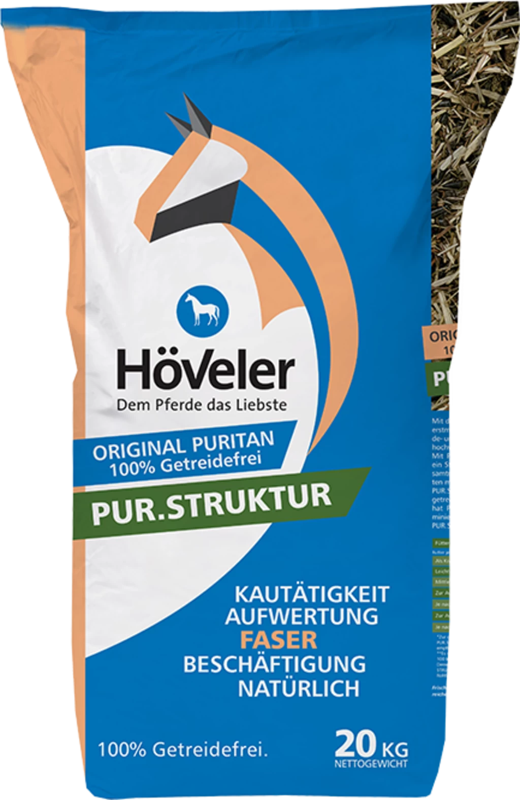 Pur.Struktur ist ein getreide- und melassefreies Strukturfutter ohne zusätzlich Vitaminierung und Mineralisierung. Dank den erlesenen Komponenten und der hochwertigen Faser kann Pur.Struktur die Gesamtration aufwerten. Außerdem reget das Futter die Kautätigkeit des Pferdes an.