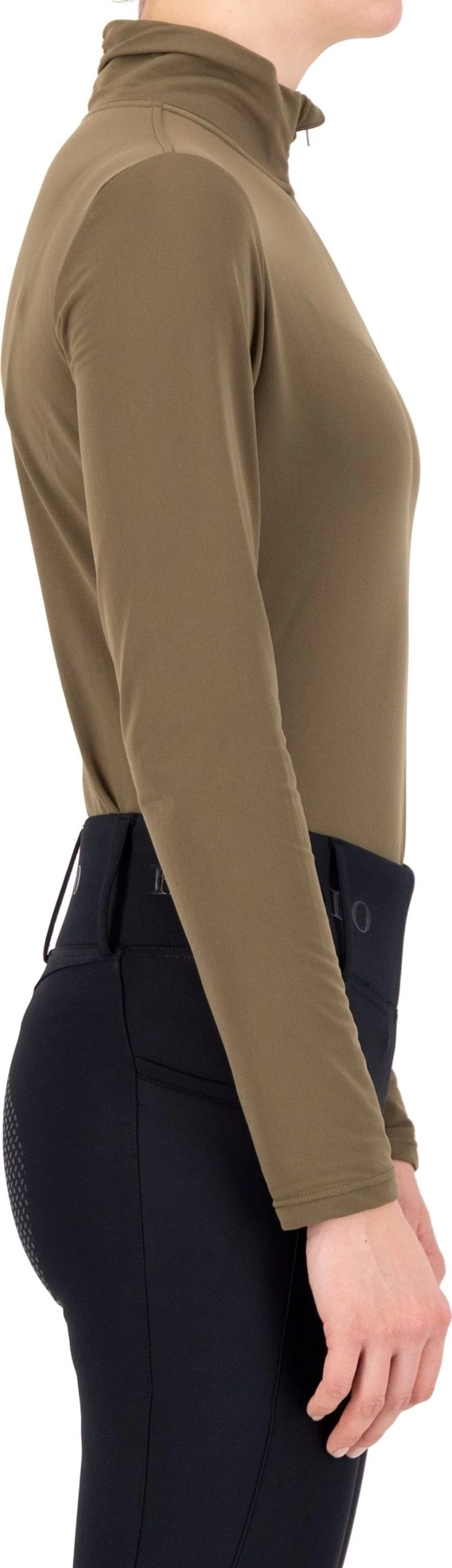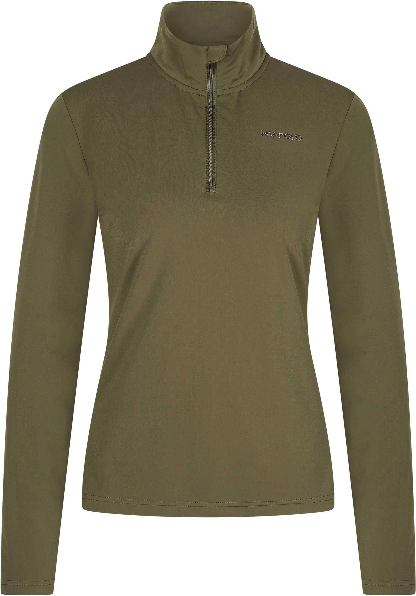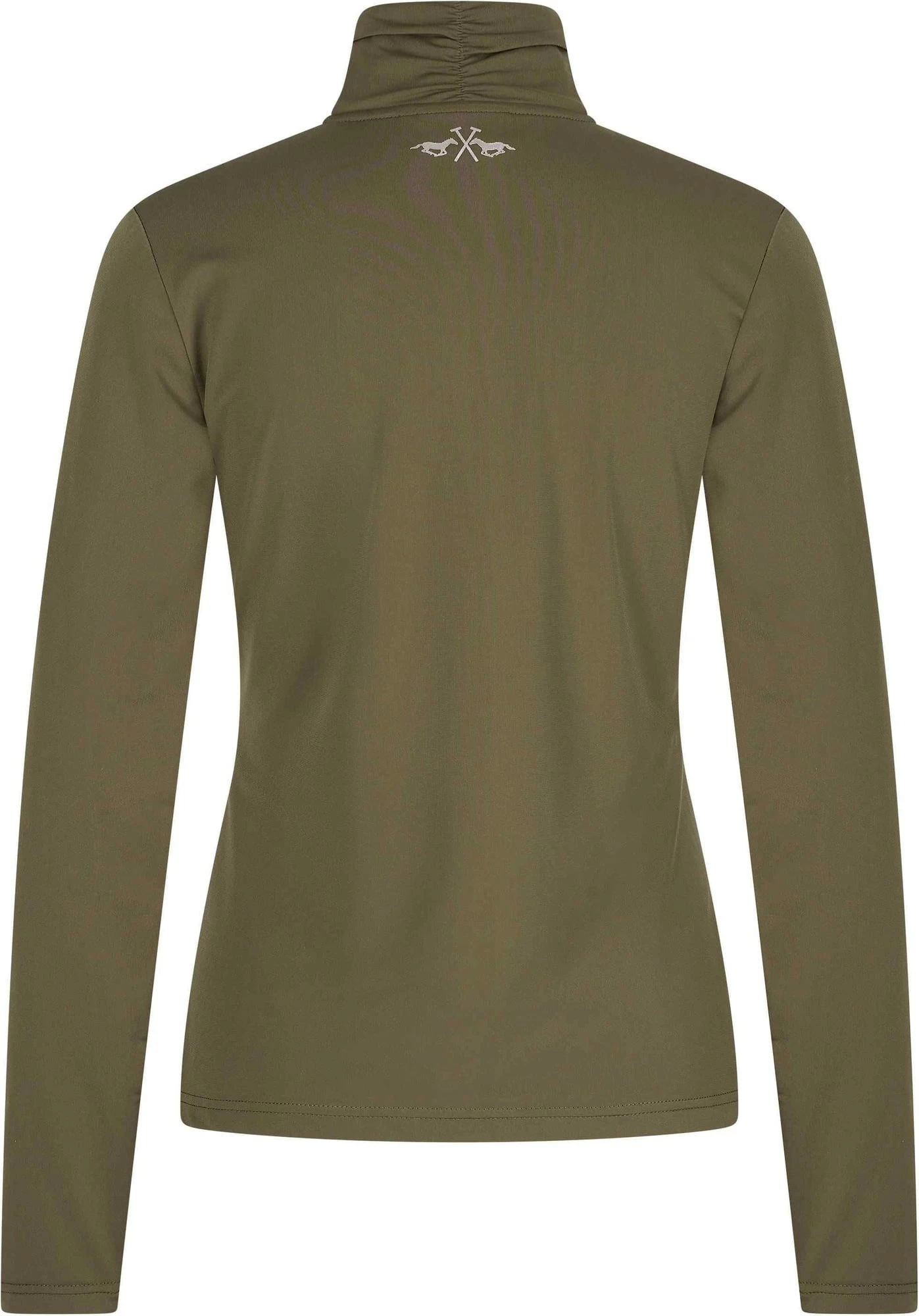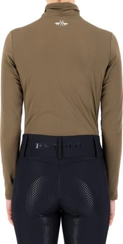 Sportliches Top mit Reißverschluss – kann einfach kombiniert werden und ist ein Muss in der Garderobe eines jeden Pferdesportfreundes. Komfortables 4-Wege-Stretch, eine gebürstete Innenseite und die hohe Atmungsaktivität optimieren die ausgezeichnete Funktion dieses Winter-Trainingslongsleeves. Textlogo auf der Brust mit aufwendigen, glasklaren Strasssteinen. Die Rückseite des Kragens ist attraktiv mit kleinen Plisseefalten eingefasst. Das Logo ist unter dem mittleren, hinteren Halsausschnitt positioniert.
