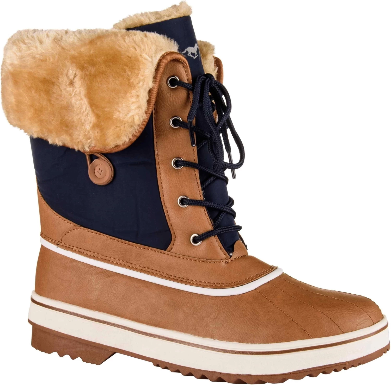 Moderner Schnürstiefel mit wasserdichter Membrantechnologie und warmem Innenfutter. Die kuschelige Fellüberlappung, sowie Highlights in Weiß und Navy, passen ideal zum zeitlosen Hellbraun.