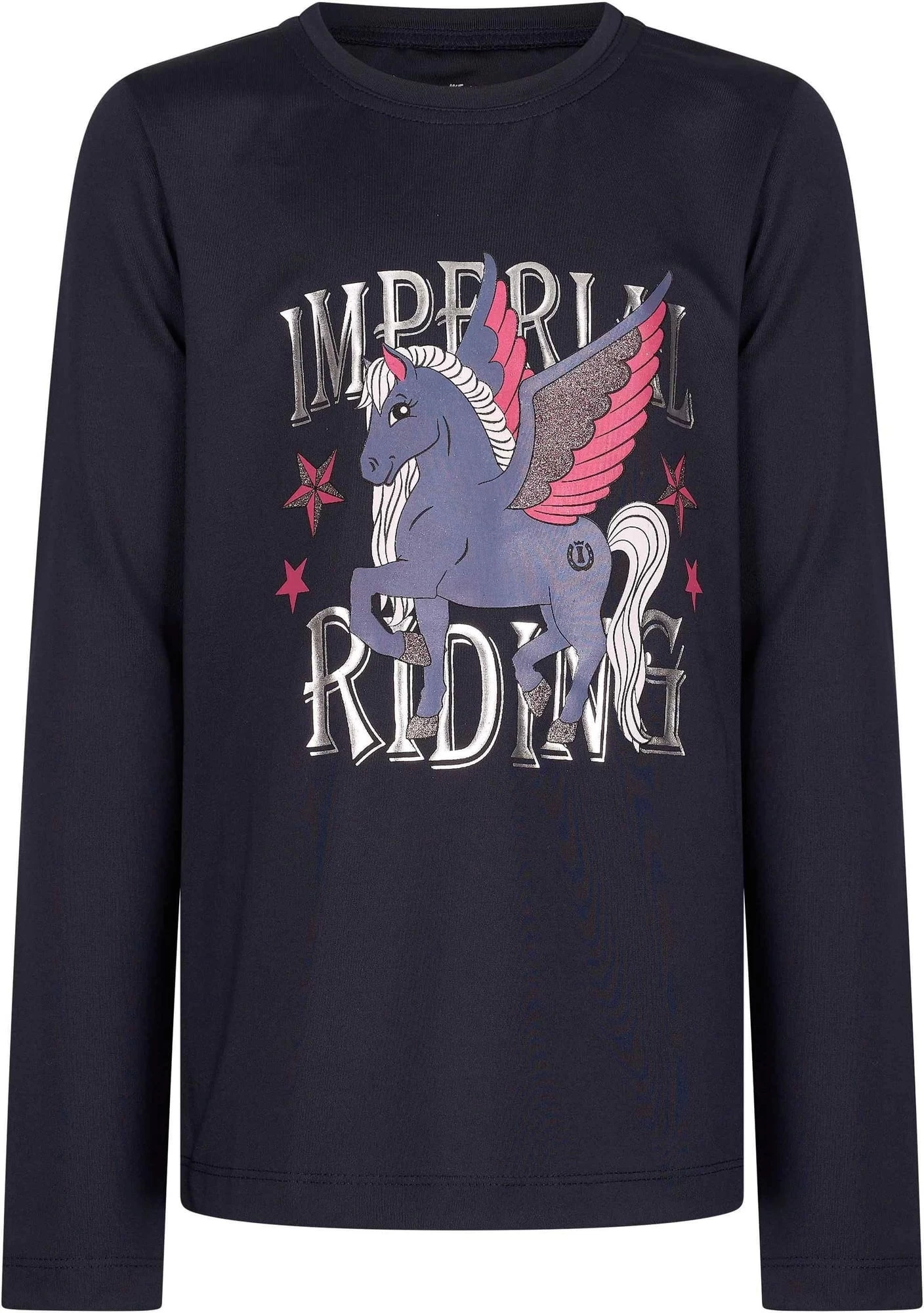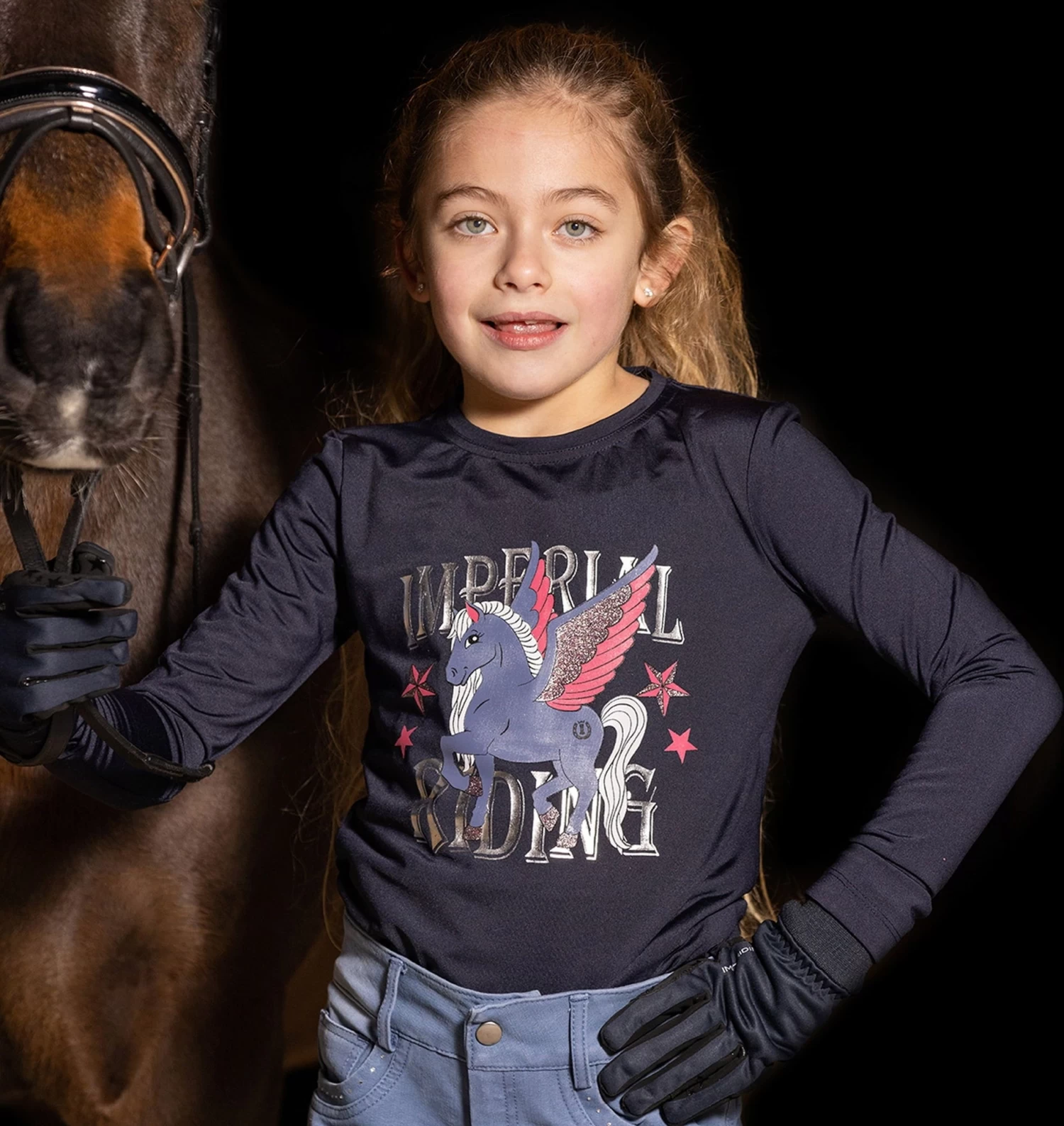 Das perfekte Funktionsshirt für Kinder. Leichtes, dehnbares Jersey verspricht angenehme Trageeigenschaften während dem Reiten. Das schlichte Navy wird über die gesamte Vorderseite von einem Imperial Riding-Kollektionsdruck geziert. Schimmernde Glitterdetails lassen den Pegasus noch besser zur Geltung kommen.