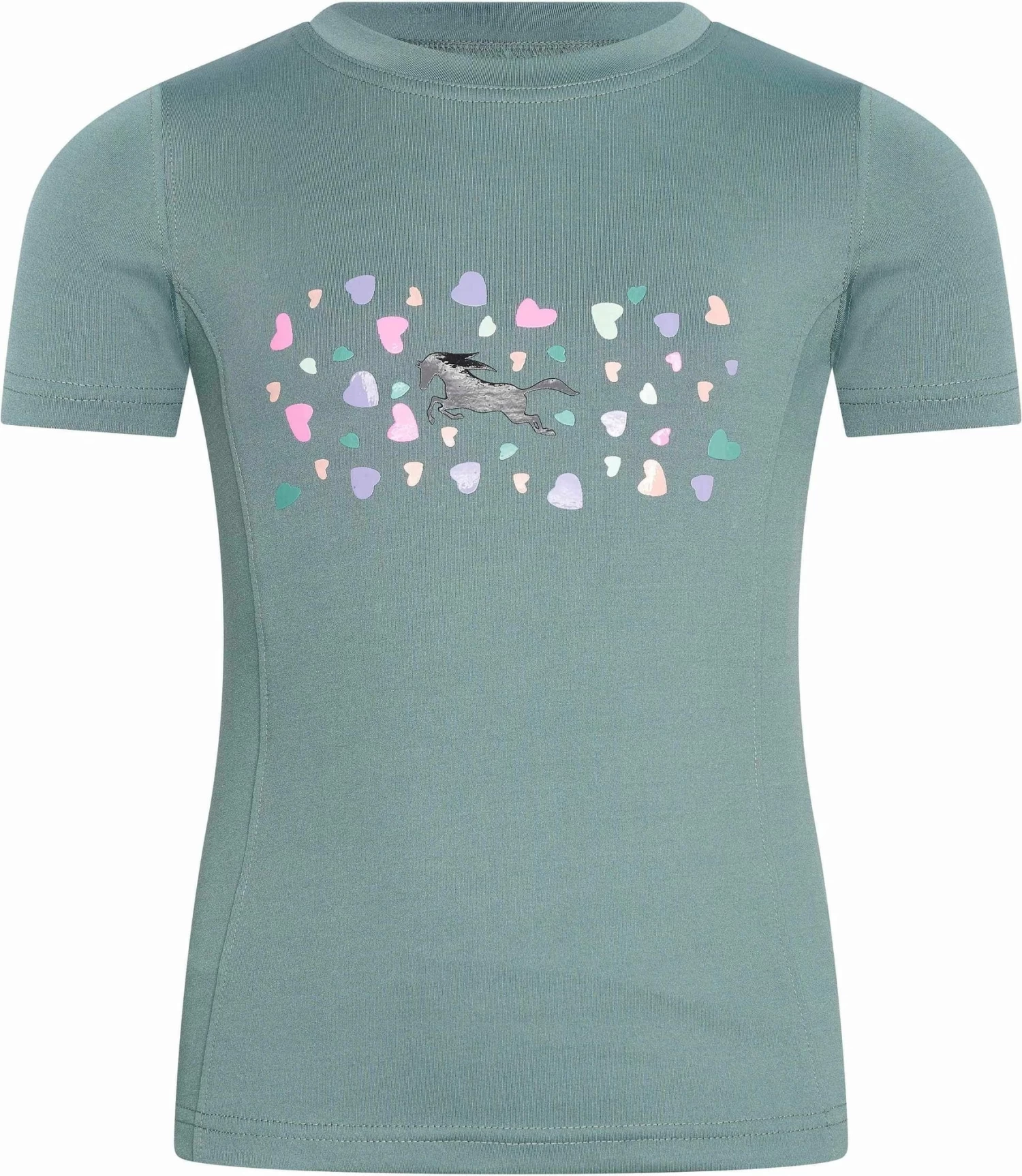 Klassisches T-Shirt mit Rundhalsausschnitt. Das liebliche Druck-Motiv mit galoppierendem Pferd, umgeben von buntem „Lovefetti“, wurde extra für Kinder designt. Micro Polyester kombiniert mit 4-Wege-Stretch verspricht einen bequemen Tragekomfort in Stall und Alltag.