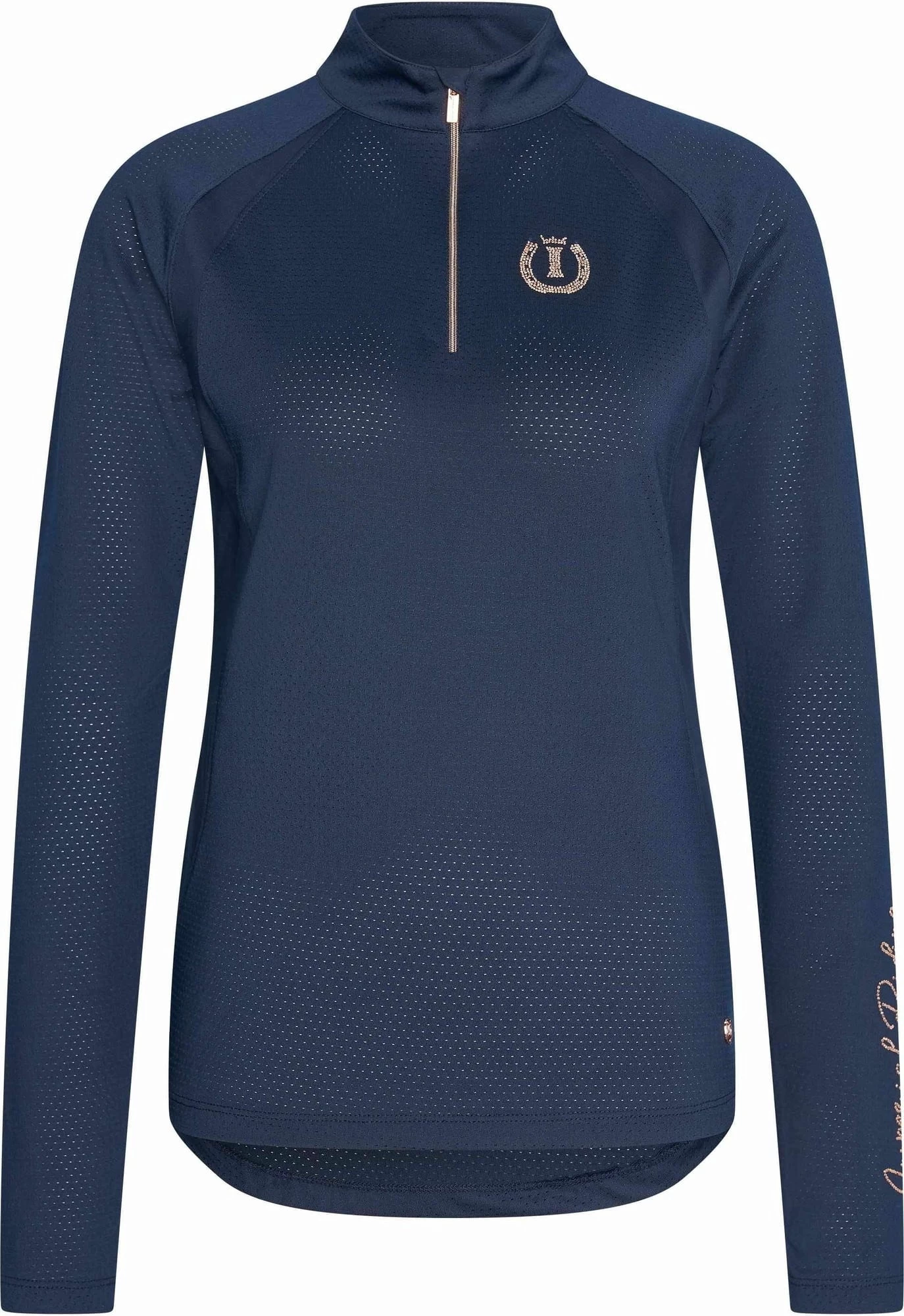 Angenehmes Shirt aus festem Tech-Jersey und kontrastierendem Mesh-Gewebe. Die elastische Materialstruktur trocknet schnell und wirkt atmungsaktiv. Reißverschluss, Strasslogo-Applikation und Münze sind farblich abgestimmt und bilden einen schönen Kontrast zum schlichten Navy.