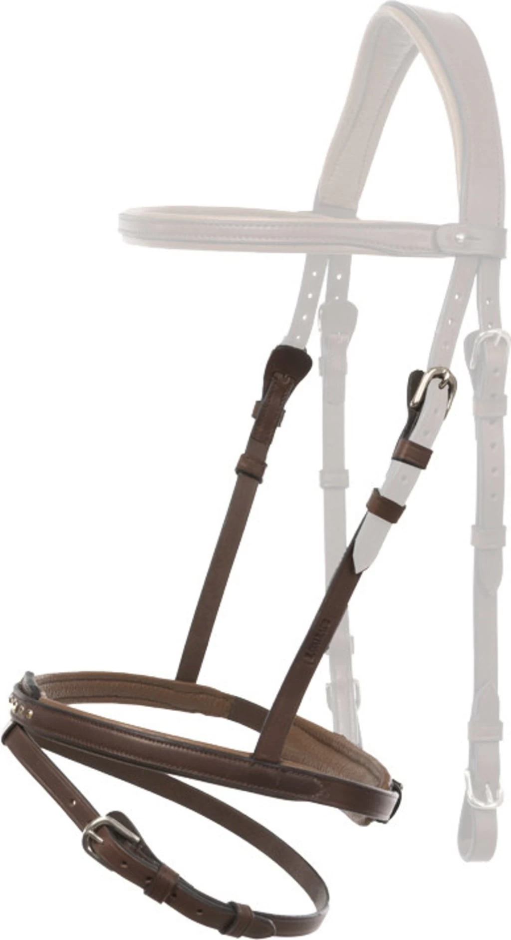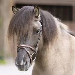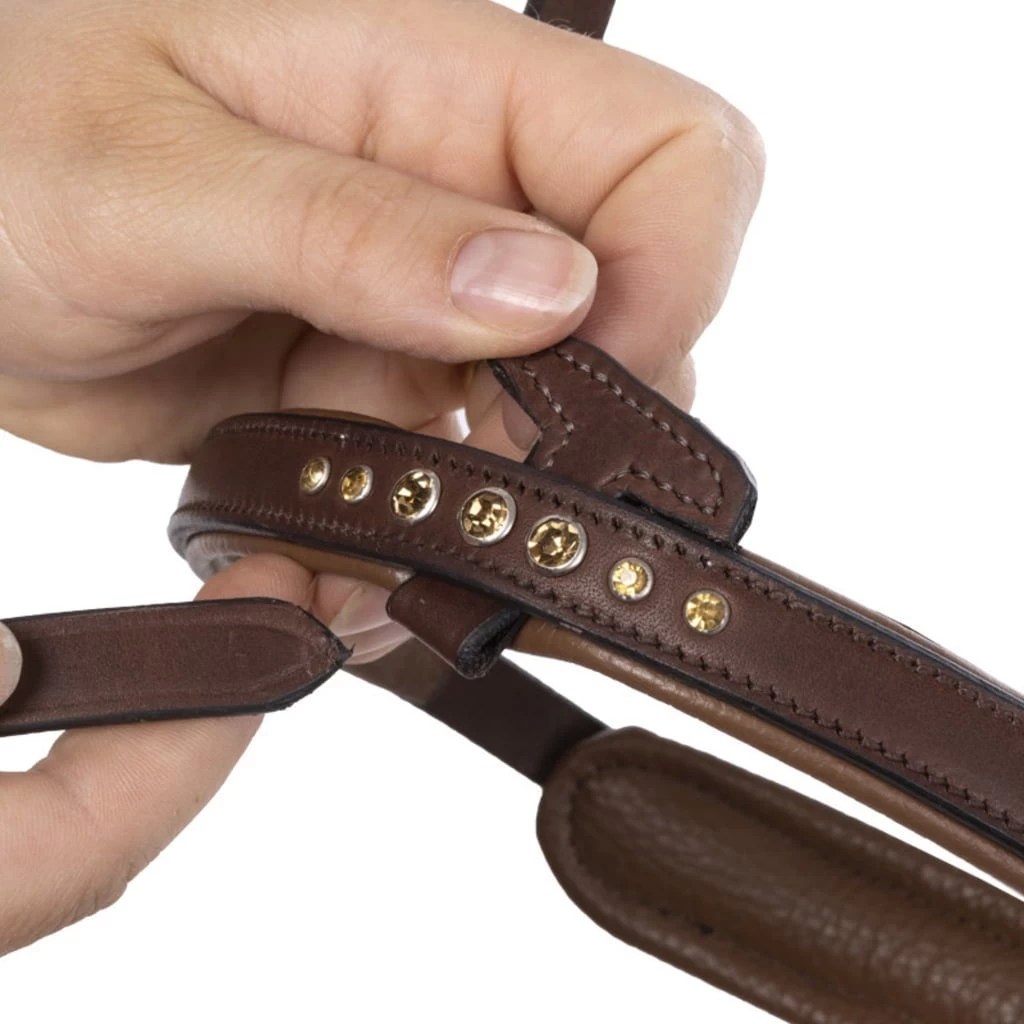 Das Reithalfter in englischer Ausführung erstrahlt im eleganten Braunton und ist am Nasenriemen mit funkelnden, goldenen Strasssteinen verziert. Die Polsterungen an Nase und Kiefer bewahren die empfindlichen Hautpartien vorm Aufscheuern. Mit abnehmbarem Sperrriemen.