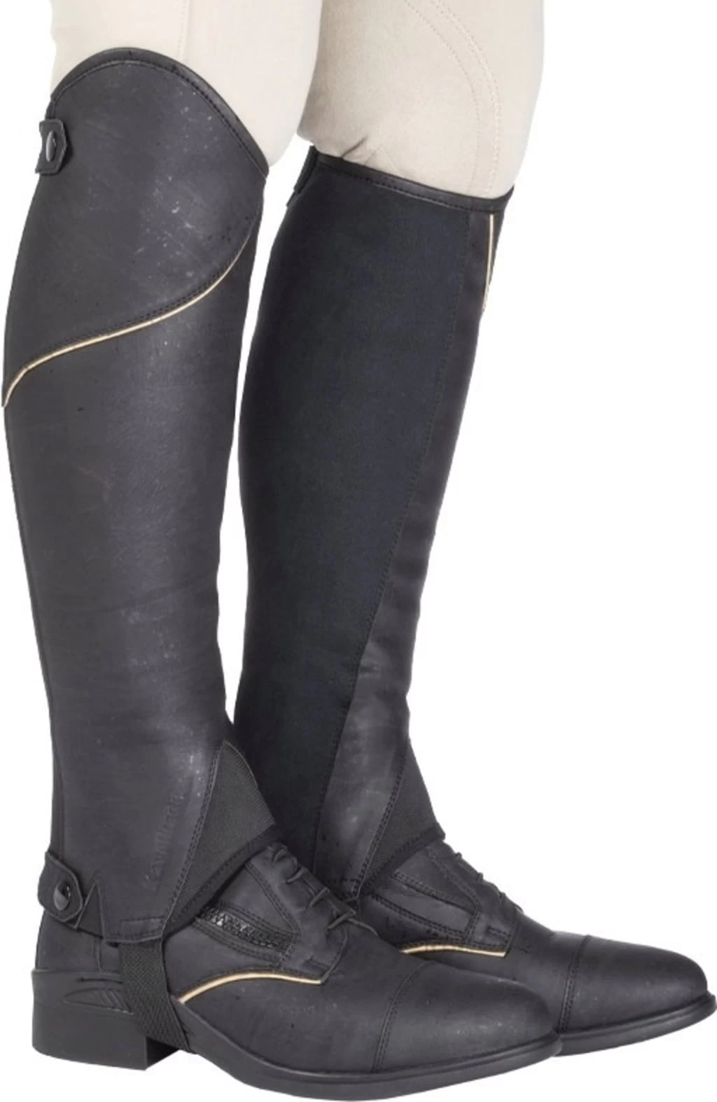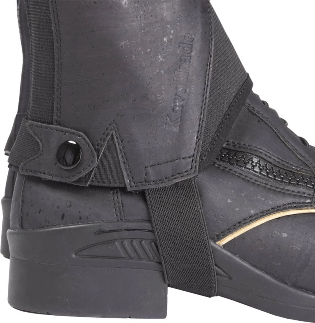 Die Wadenchaps aus Kork bilden die ideale Ergänzung zu den Stiefeletten der Produktlinie „Cortica“. Ihr Außenmaterial aus Kork wird an den Wadeninnenseiten mit synthetischem Lederimidat ‚Amara‘ kombiniert, um eine bessere Haftung am Sattel zu erzielen. Die Innenseite der Chaps besteht aus einem Textilfutter, das sich angenehm weich an das Bein anlegt. Elastische Einsätze erleichtern das Anziehen und unterstützen eine optimale Passform. Elegante Kontraststreifen runden das schlichte Design ab.