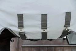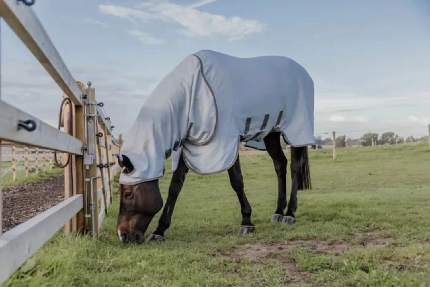 Die helle Farbe der Decke reflektiert Sonnenstrahlen und vermeidet Wärmestau. Mit einem besonders langen Halsteil, das über den Ohren befestigt wird, ist auch der Pferdehals vollständig geschützt. Die Decke wird mit fünf Klettverschlüssen geschlossen, während der Bauchlatz mit drei geraden Gurten gesichert wird. Zudem ist der Schweiflatz etwas länger als üblich und verfügt über einen elastischen Schweifriemen für zusätzlichen Halt.