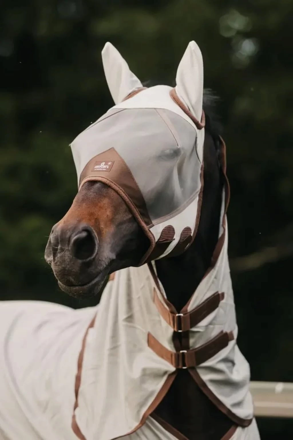 Die Maske selbst wurde aus atmungsaktivem Mesh-Gewebe gefertigt, die Ohren bestehen aus effektivem Fliegen-Strickgewebe. Beide Materialien sind robust, sodass die Maske auch spielenden Pferden standhält.