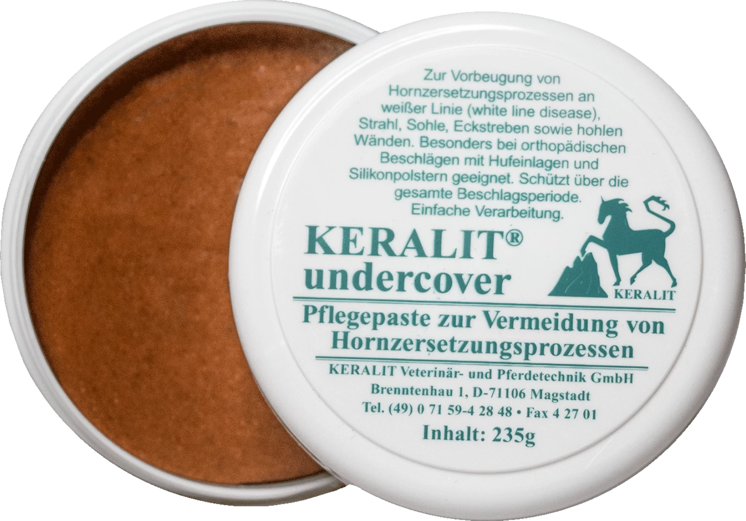 Keralit Undercover hilft durch die Bildung eines konstant fäulnishemmenden Milieus Hornzersetzungsprozessen an hohlen Wänden, Sohle, Strahl, Eckstreben sowie Weißer Linie vorzubeugen.