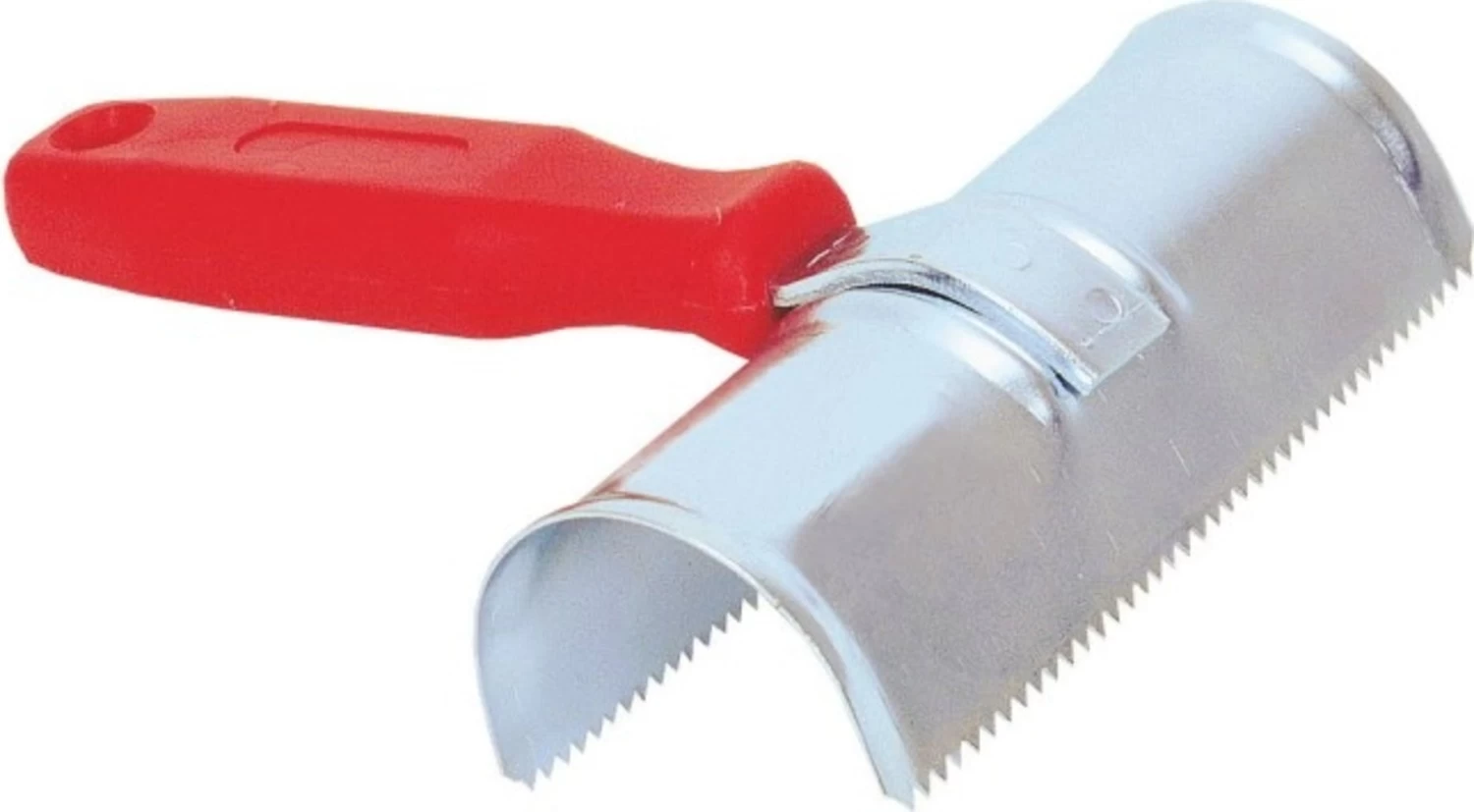 Halbrunder Striegel aus verzinktem Metall mit Kunststoffgriff. Feine Zacken entlang der Kanten erleichtern das Entfernen von groben, trockenen Schmutzklumpen.