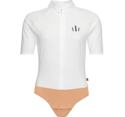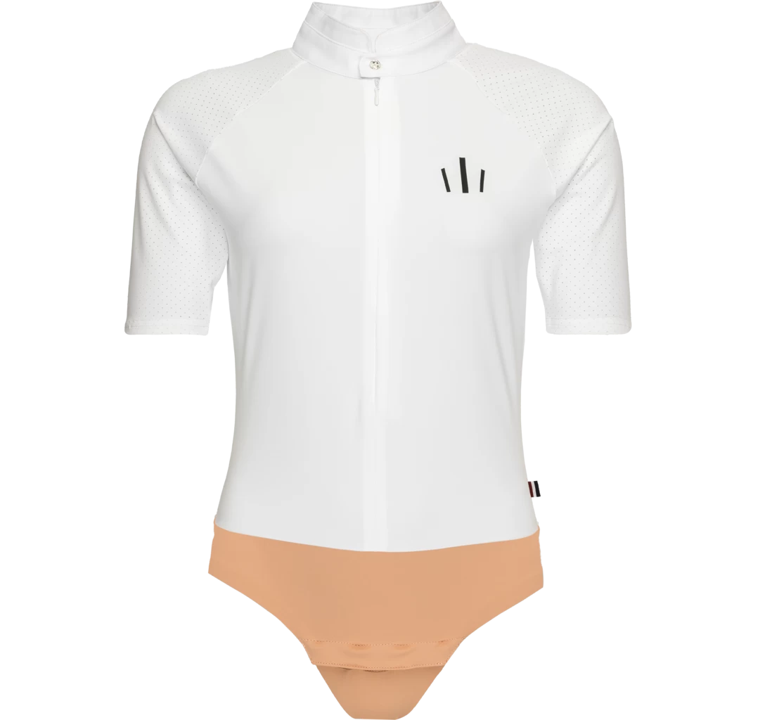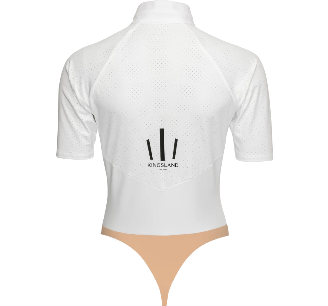 Eine als Bodystocking designte Turnierbluse, die immer perfekt sitzt. Das lasergeschnittene Material ist besonders atmungsaktiv. Verziert mit einem Kingsland Kronen-Print und funkelnden Swarovski®-Kristallen am Kragen