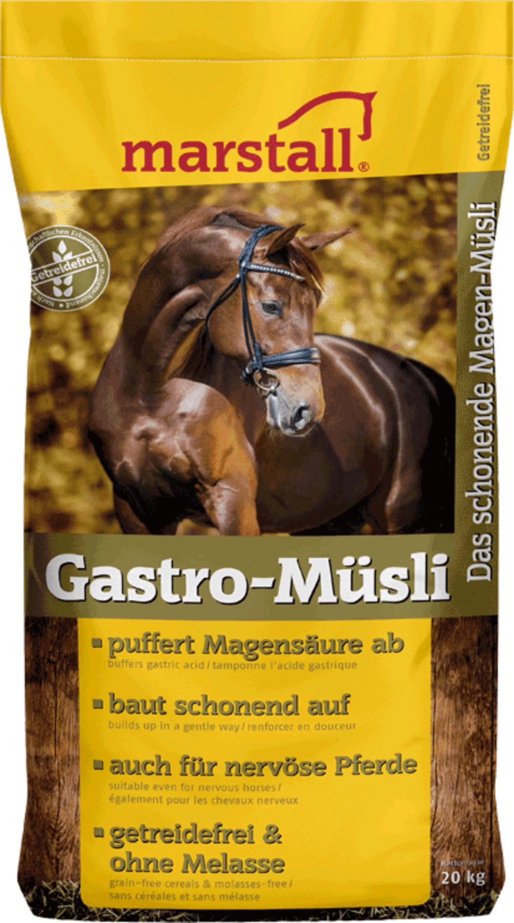 Der hohe Strukturgehalt regt die Kautätigkeit und fördert die Bildung Speichel. Da Magenprobleme oft in Kombination mit Stress auftreten, wurde dem Gastro-Müsli Magnesium zugesetzt.