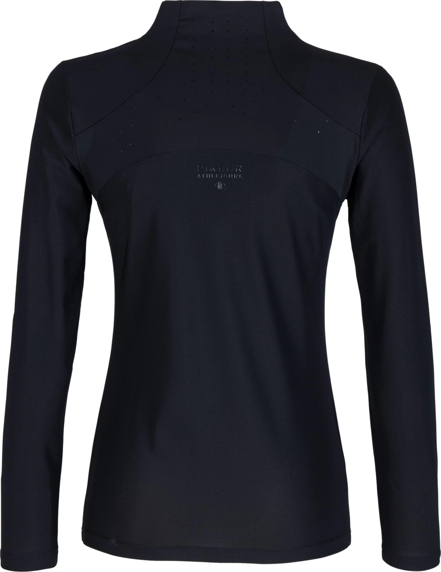 Das Highlight dieses Shirts ist die clevere Perforation, die für eine optimale Belüftung sorgt. Die Passe, der halbe Rücken, die Ärmel und die Seitenteileinsätze bestehen aus blickdichtem Mesh, welches zusammen mit dem Lasercuteinsatz am Rücken die Luftzirkulation noch weiter fördert und zeitgleich für einen modernen Look sorgt. Glänzende Prints auf der Brust und dem Rücken setzen modische Akzente und machen dieses Langarmshirt zu einem echten Blickfang im Reitstall.