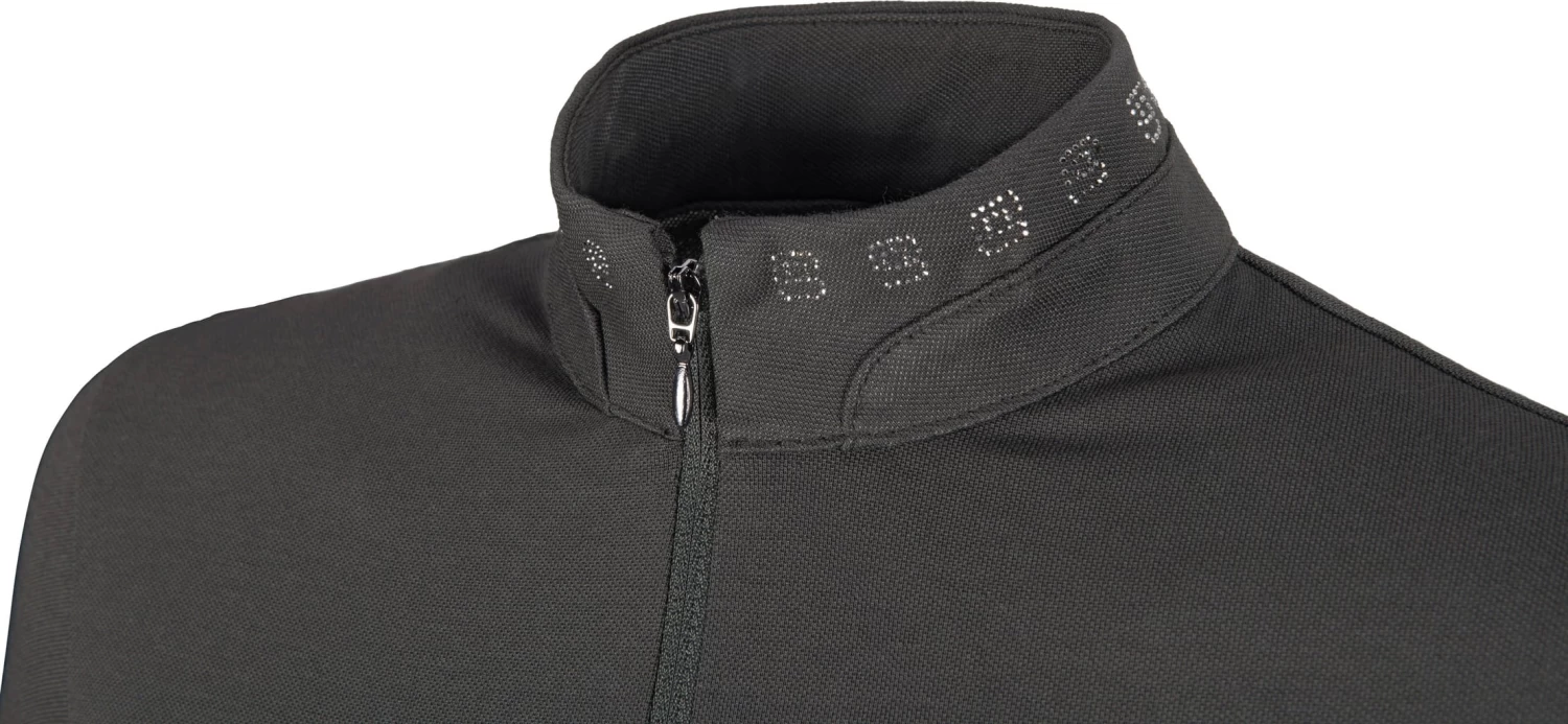 Das Shirt verfügt über einen leicht hochabschließenden Kragen, der mit einem Reißverschluss nach Belieben geöffnet oder geschlossen werden kann. Edle Strass-Applikationen am Kragen sowie das PIKEUR-Labeling auf dem Ärmel sorgen für dezente, verspielte Details und runden das Design optimal ab.