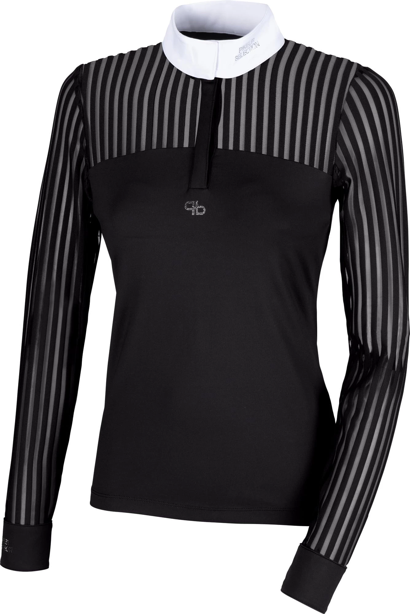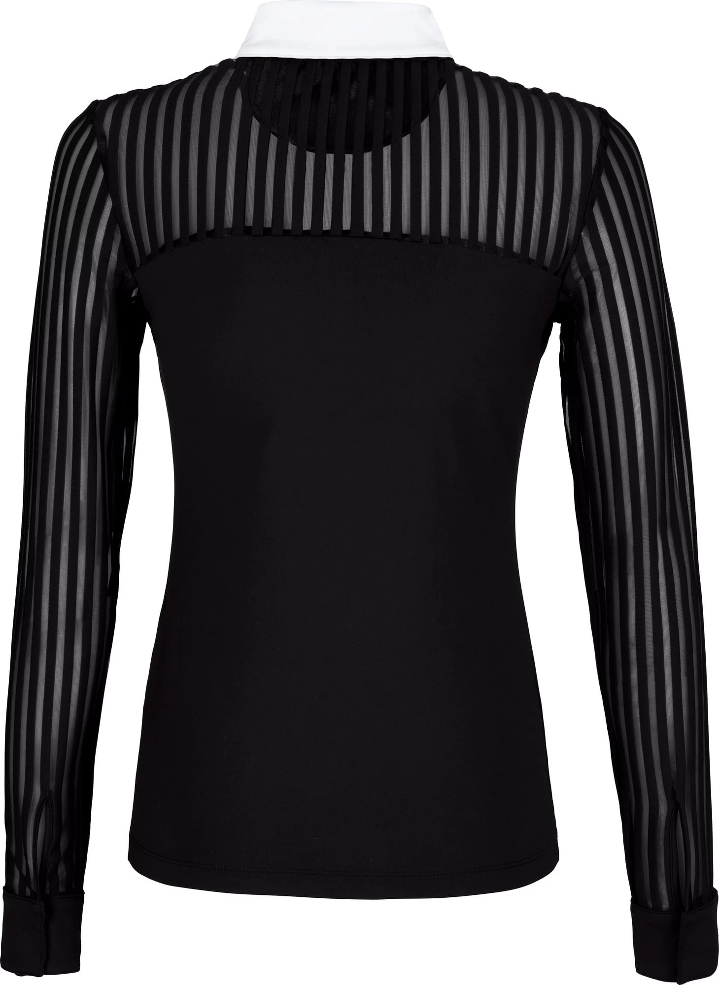Diese elegante Reitbluse aus hochwertigem Funktionsstoff kombiniert Funktionalität mit stilvollen Details, um Reiter:innen einen edlen Auftritt im Sattel zu ermöglichen. Die Ärmel, die Vorder- und Rückenteilpasse sind aus gestreifter Meshware gefertigt, was für eine effektive Belüftung sorgt.