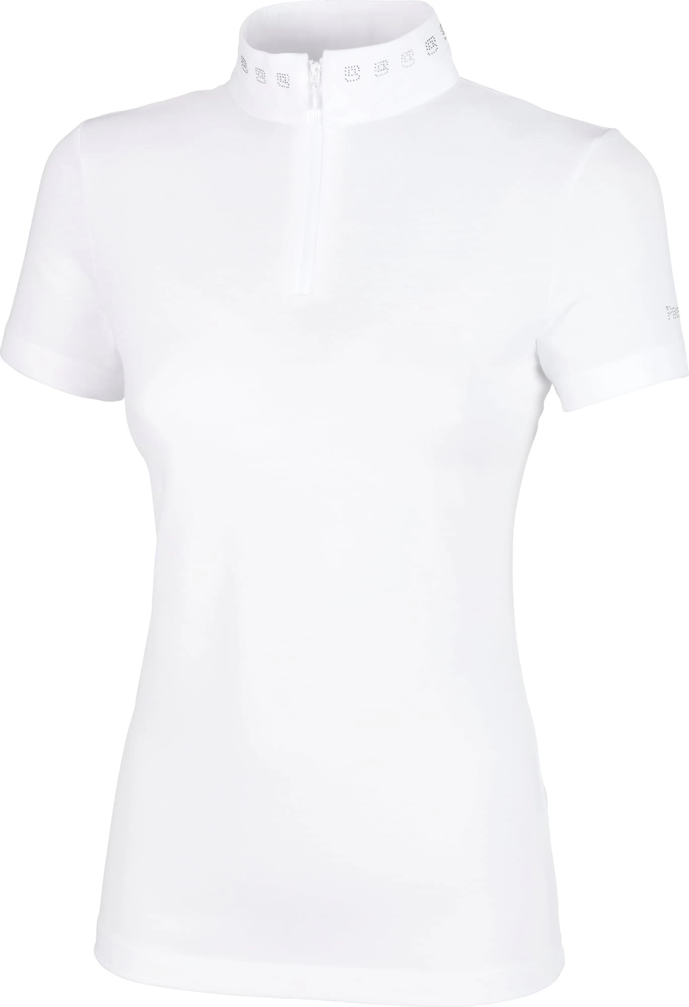 Das Shirt verfügt über einen leicht hochabschließenden Kragen, der mit einem Reißverschluss nach Belieben geöffnet oder geschlossen werden kann. Edle Strass-Applikationen am Kragen sowie das PIKEUR-Labeling auf dem Ärmel sorgen für dezente, verspielte Details und runden das Design optimal ab.