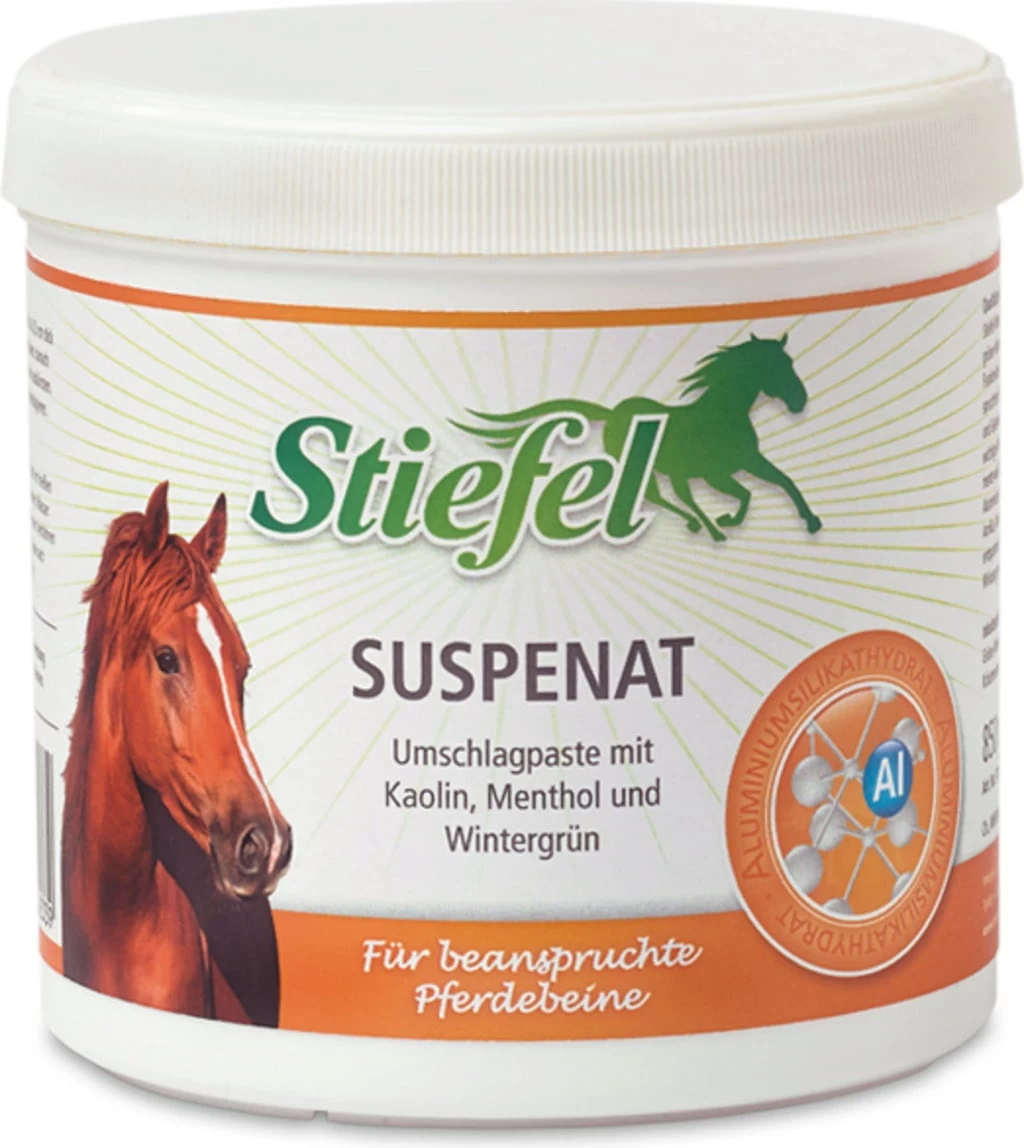 Stiefel Kaolin Paste ist eine Umschlagpaste mit Kaolin, Menthol und Wintergrün für beanspruchte Pferdebeine. Kaolin ist eine Verbindung aus Aluminiumsilikat und Wasser und zählt zu den weißen Heilerden. Stiefel Suspenat kann zum Kühlen von belasteten oder schmerzhaften Gelenken und Sehnen eingesetzt werden. Zudem kann Stiefel Suspenat als Warmanwendung bei Muskelverspannungen eingesetzt werden.
